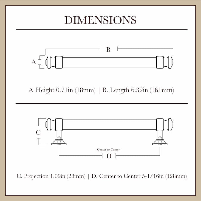 Q: How do I install the Bryn Champagne Bronze Cylindrical Bar Pull? A: Installation is simple with rear-mount design and included 1-inch screws, fitting door or drawer faces from 5/8-in to 3/4-in thickness.