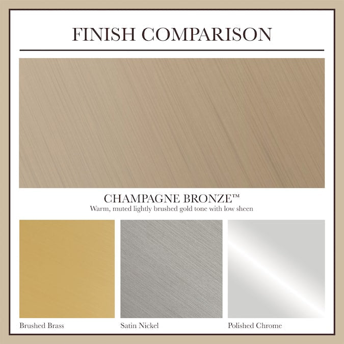 Color: Champagne bronze offers a warm, muted gold tone with light brushing and low sheen.