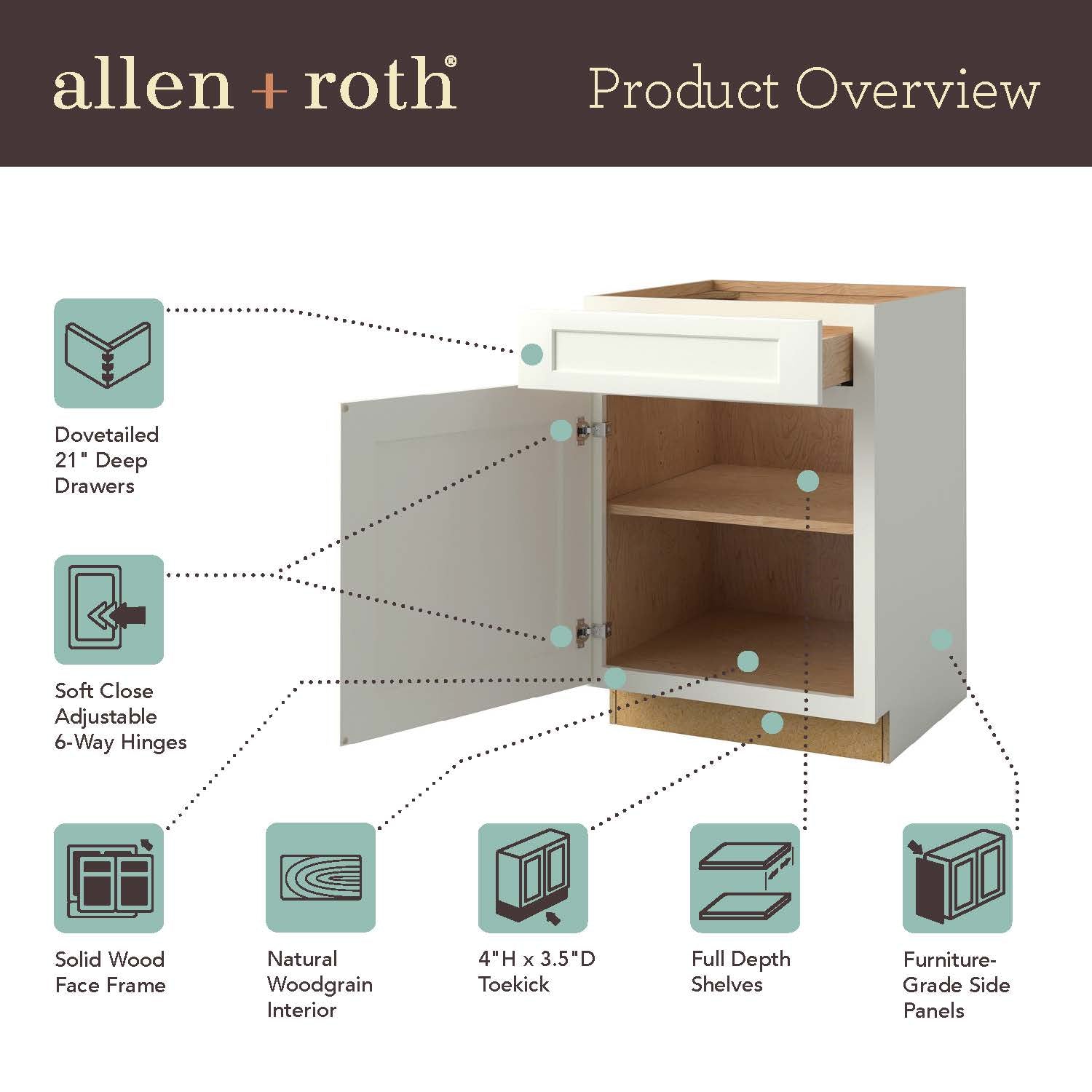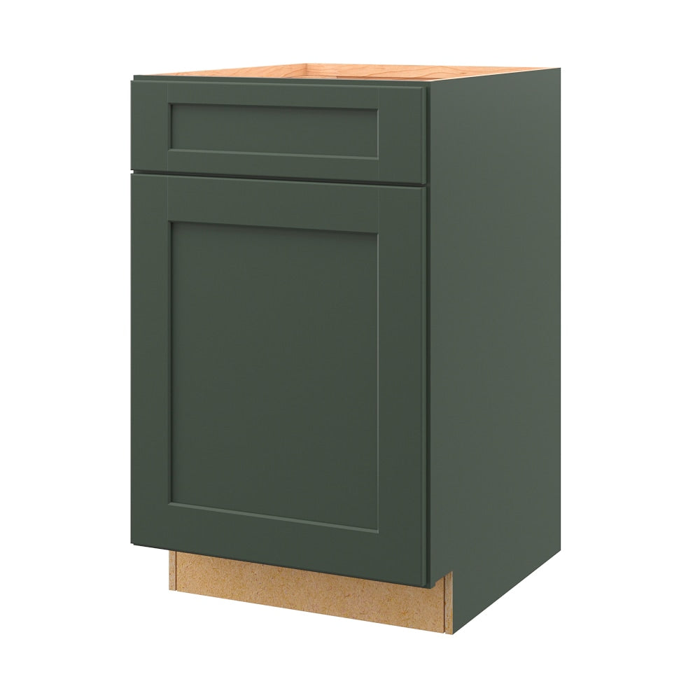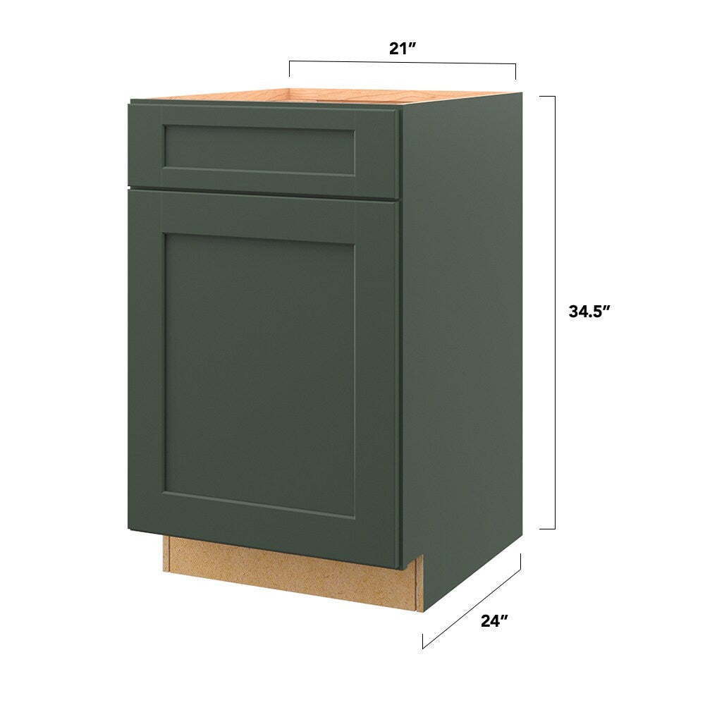 Elevate your kitchen or bathroom with the allen + roth Galway Sage Base Cabinet, a modern interpretation of the classic Shaker style. This fully assembled cabinet offers lasting durability with its blend of hardwoods and engineered materials, finished in an elegant dark sage hue to create a serene, nature-inspired ambience.
