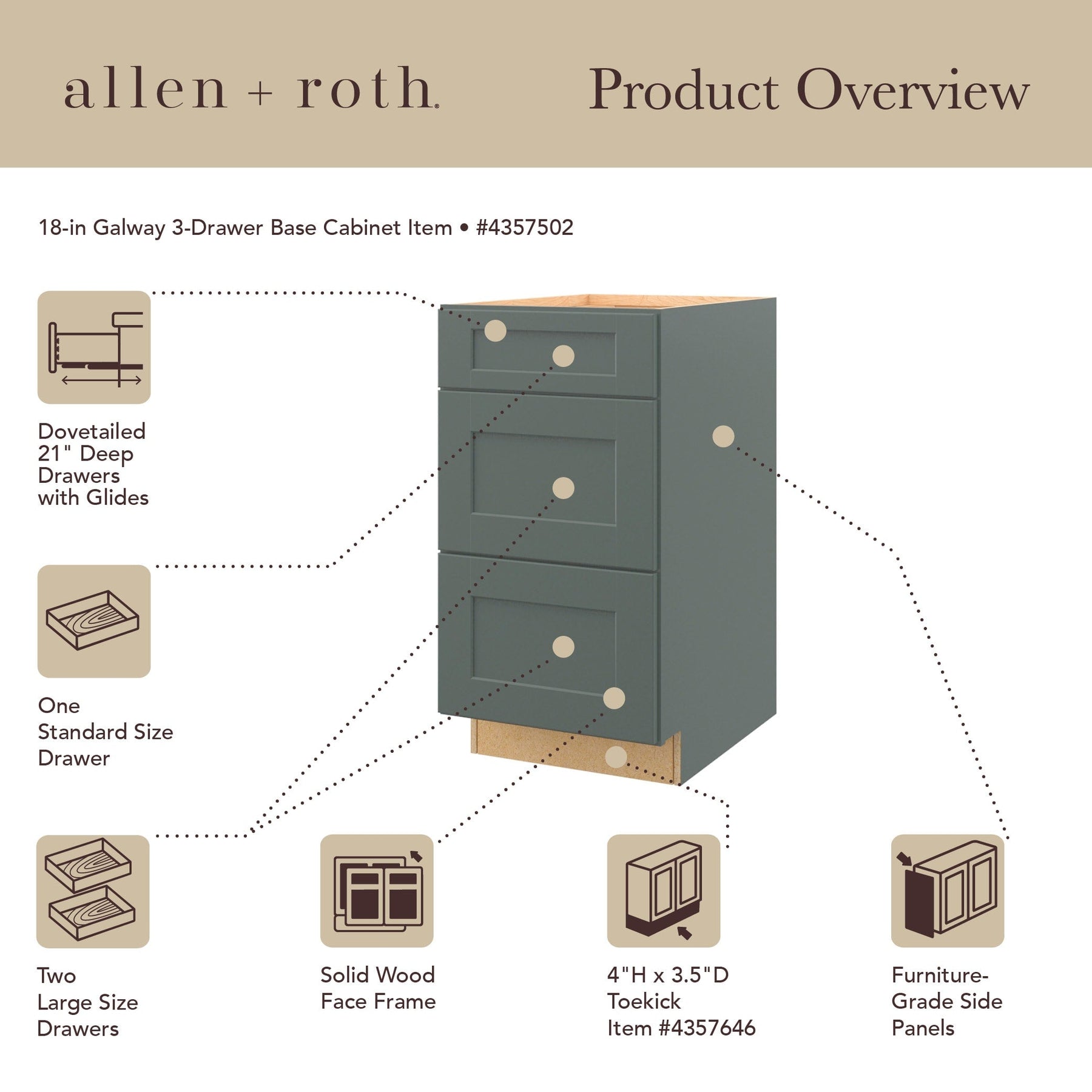 The allen + roth Galway Base Cabinet combines functional design with a tranquil sage finish to create a stylish and enduring cabinetry solution. Its fully assembled shaker style ensures modern elegance, while soft-close doors and drawers reflect premium quality and craftsmanship.