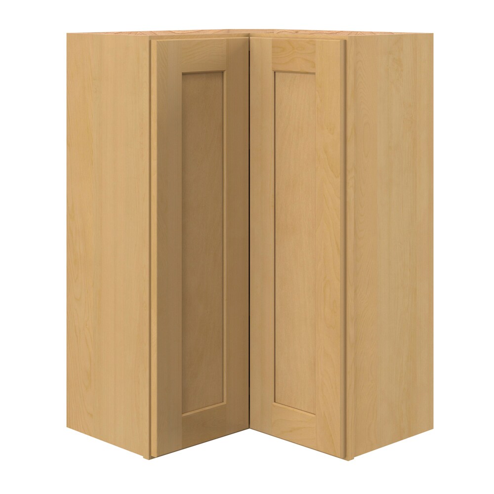 The Glenloch Rye Corner Wall Cabinet by allen + roth elegantly optimizes corner spaces with its flat panel square style. Fully assembled for convenience, its warm rye finish offers timeless charm while the self-closing, full overlay doors ensure a seamless, modern look.