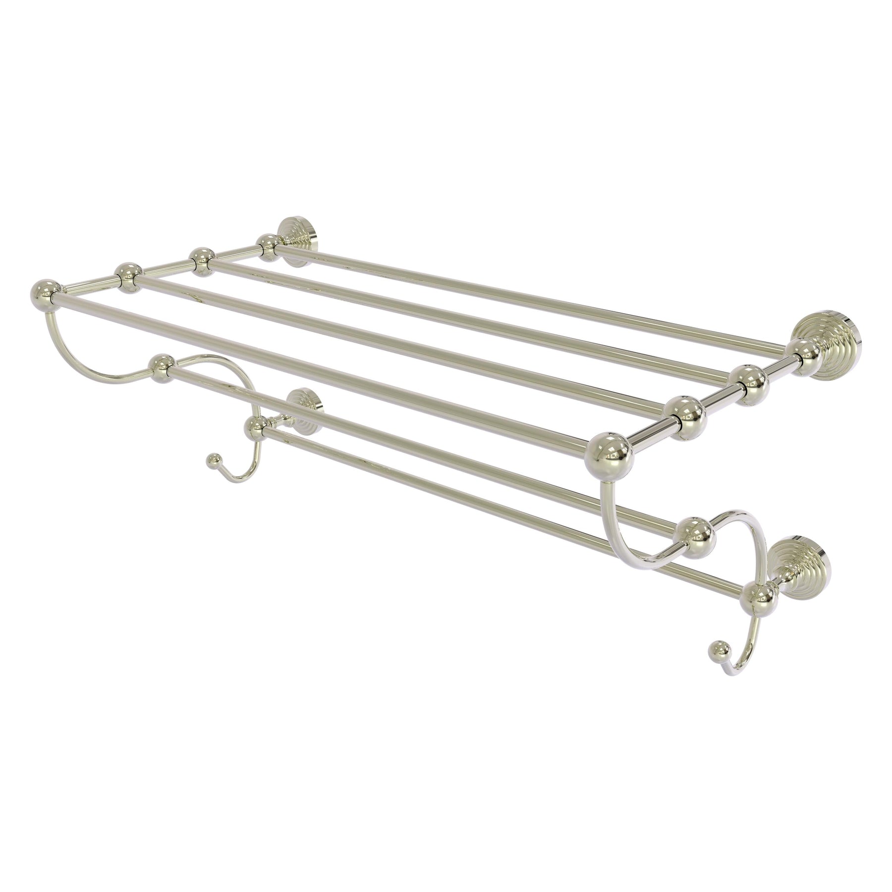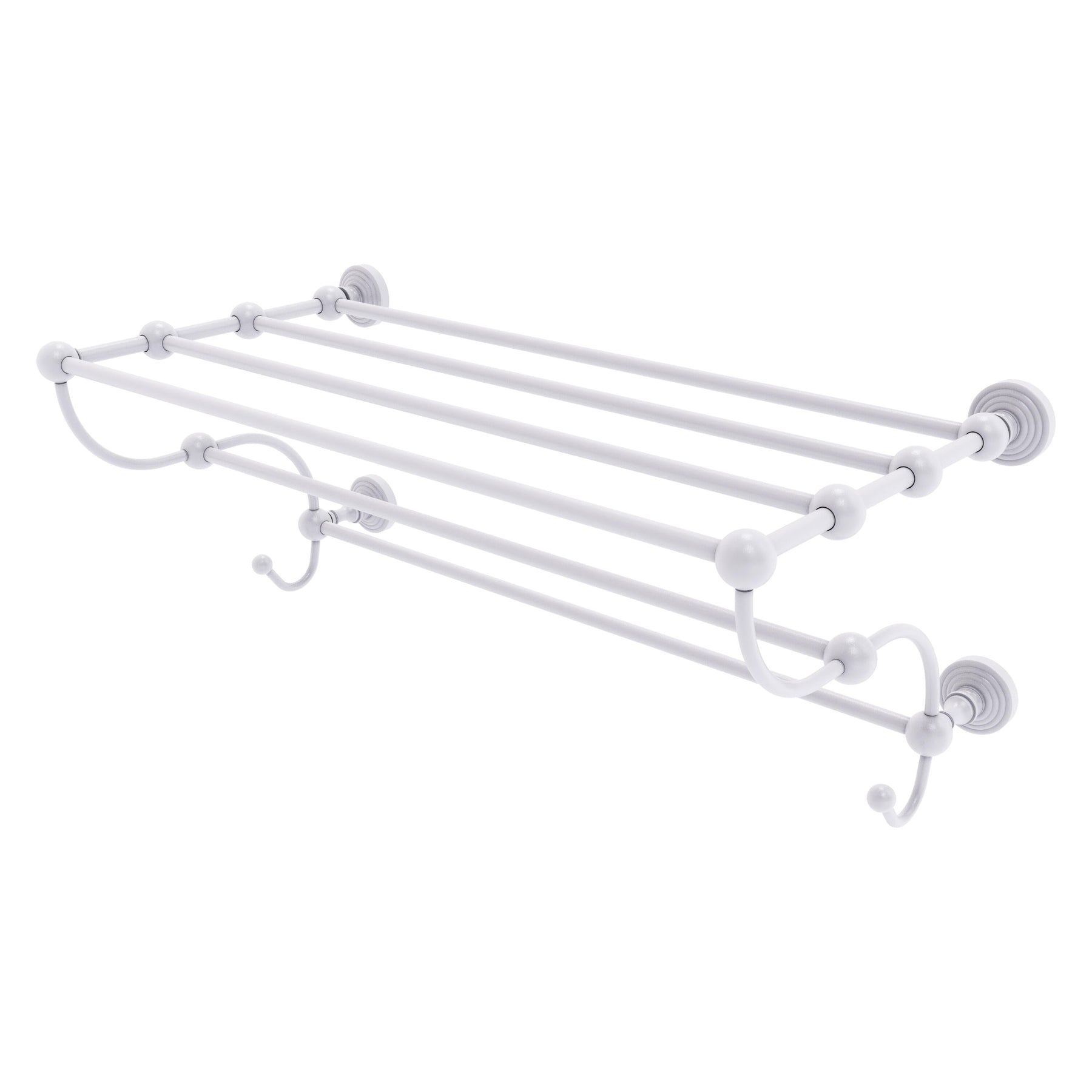 Elegant wall-mounted train rack towel shelf from Allied Brass’ Waverly Place collection, crafted from solid brass with a brushed bronze finish. Provides a spacious upper shelf with integrated bars and hooks to neatly store and dry towels in style.