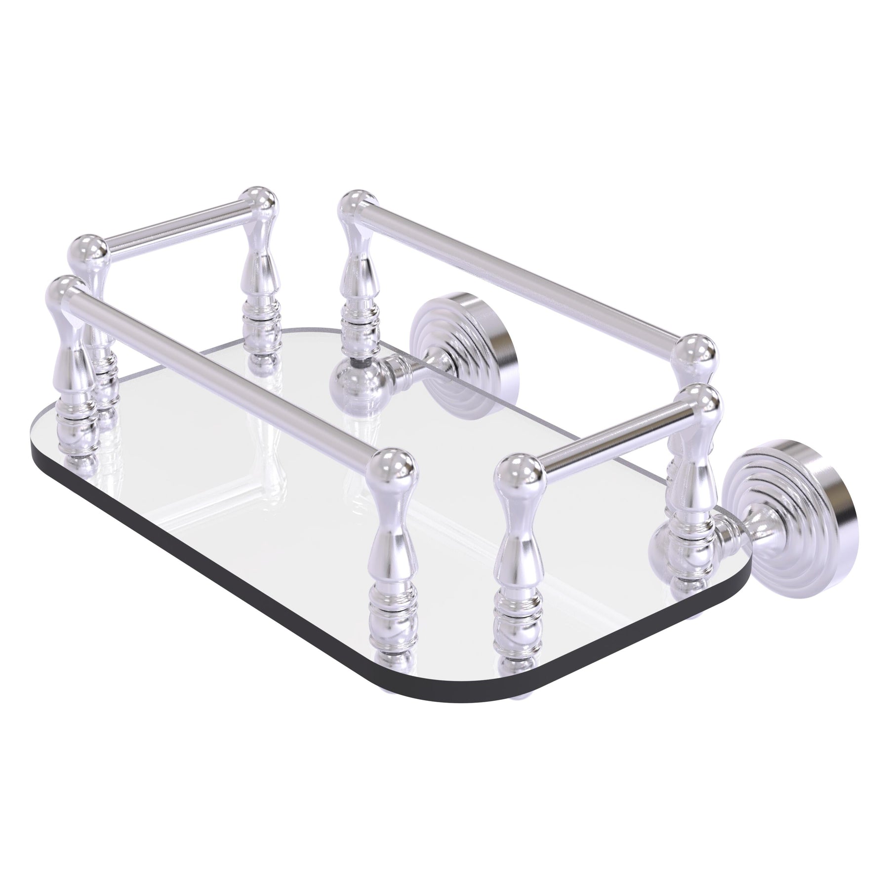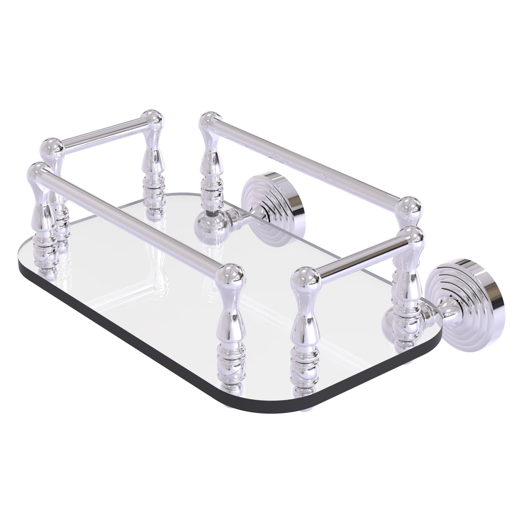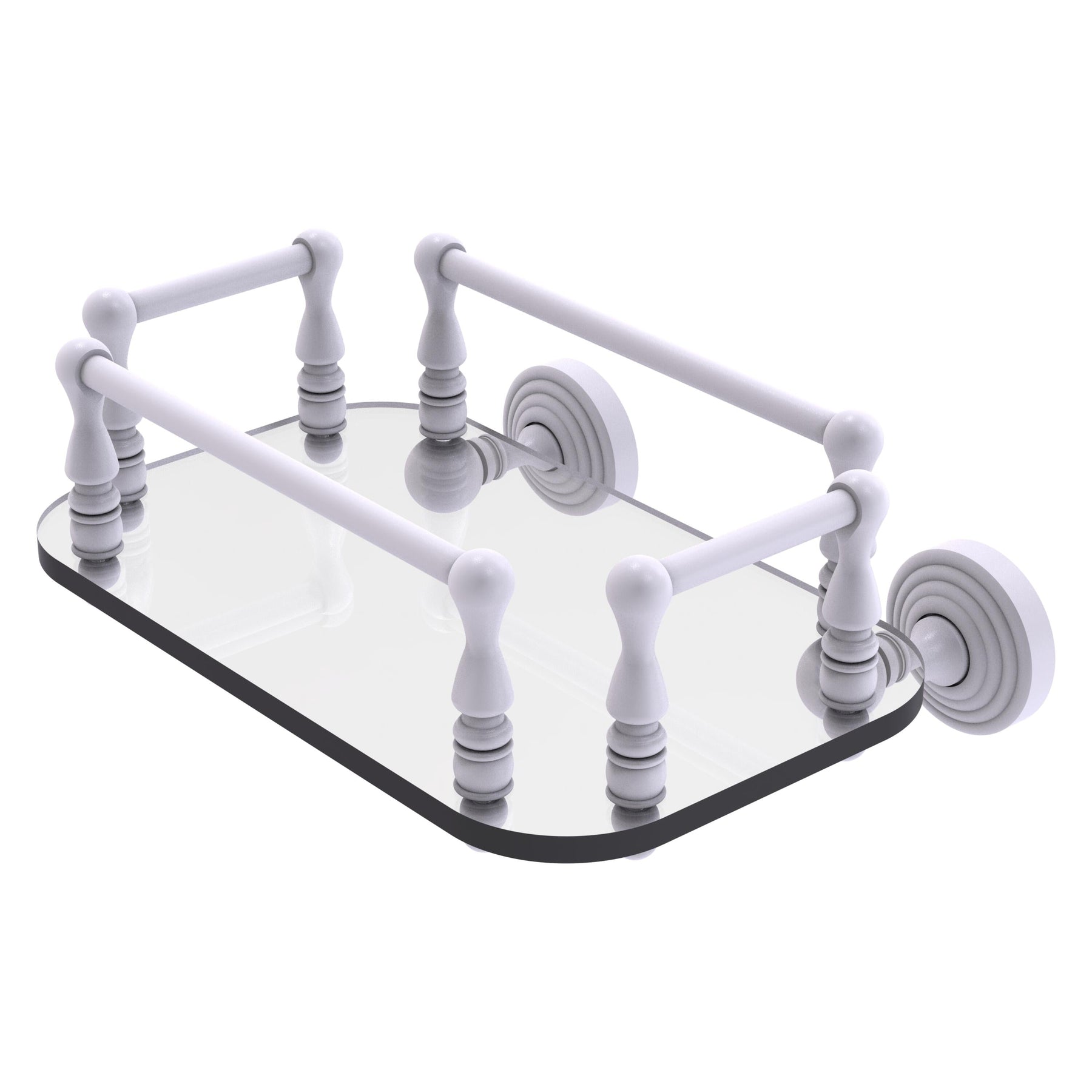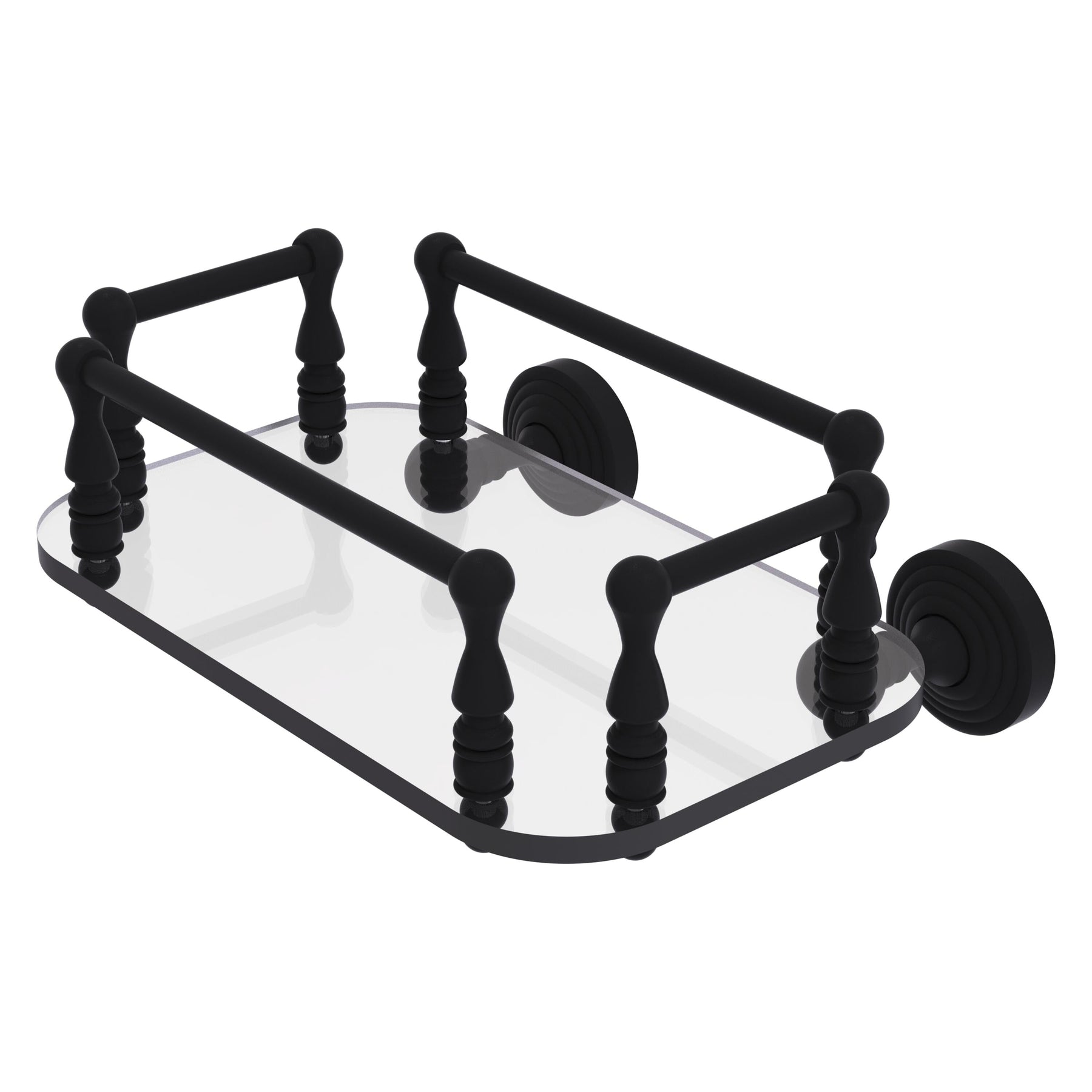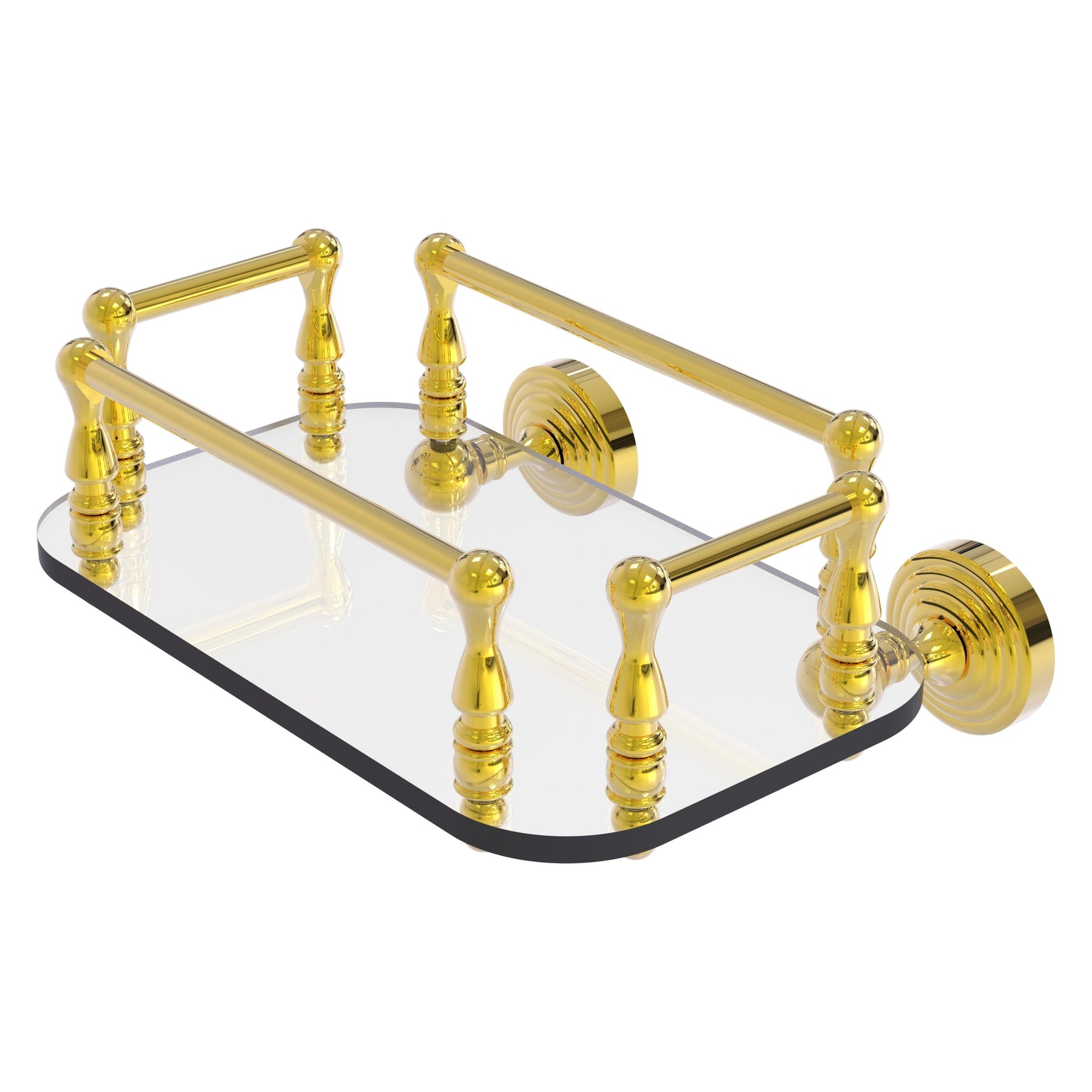 Elegant wall-mounted tray keeps guest towels or a tissue box neatly within reach. Crafted with a clear glass base and solid brass rails in a durable designer finish for lasting, corrosion-free performance.