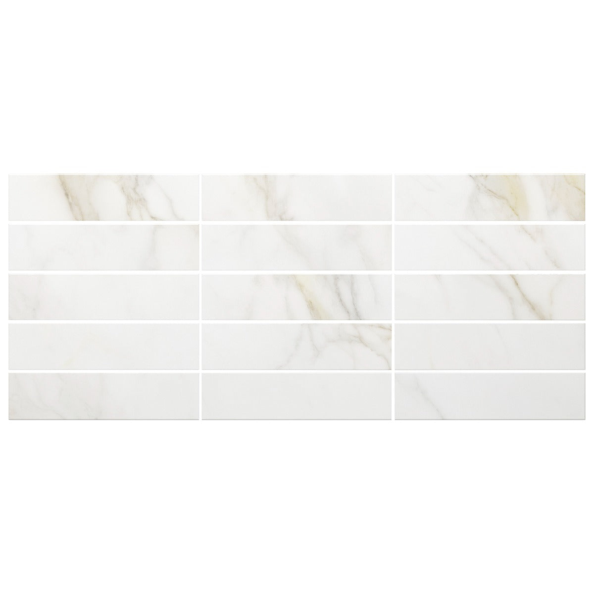 The Amalfi Calacatta Subway Tile features a polished finish and a marble-like design with warm white tones and gold veining, perfect for creating a sophisticated and elegant look in any space.