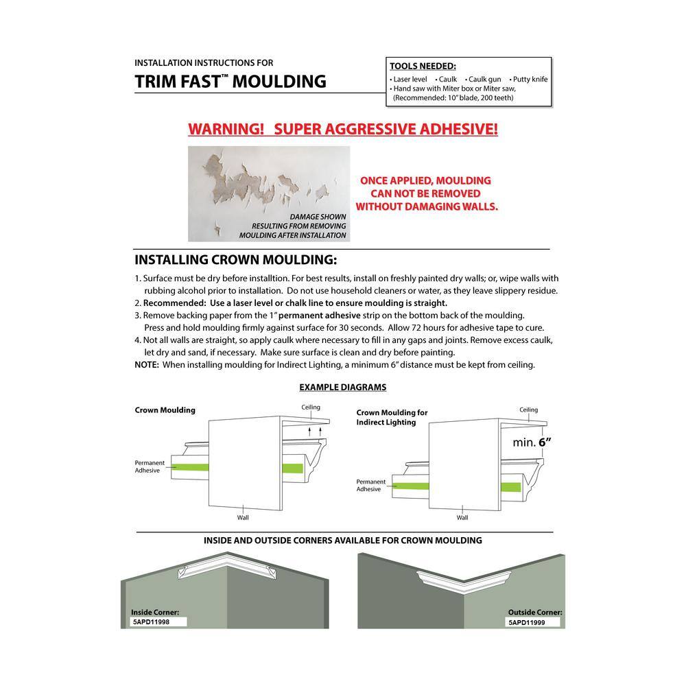 Q: How is the moulding installed? A: Installation is simple with the peel-and-stick adhesive backing that requires no special tools.