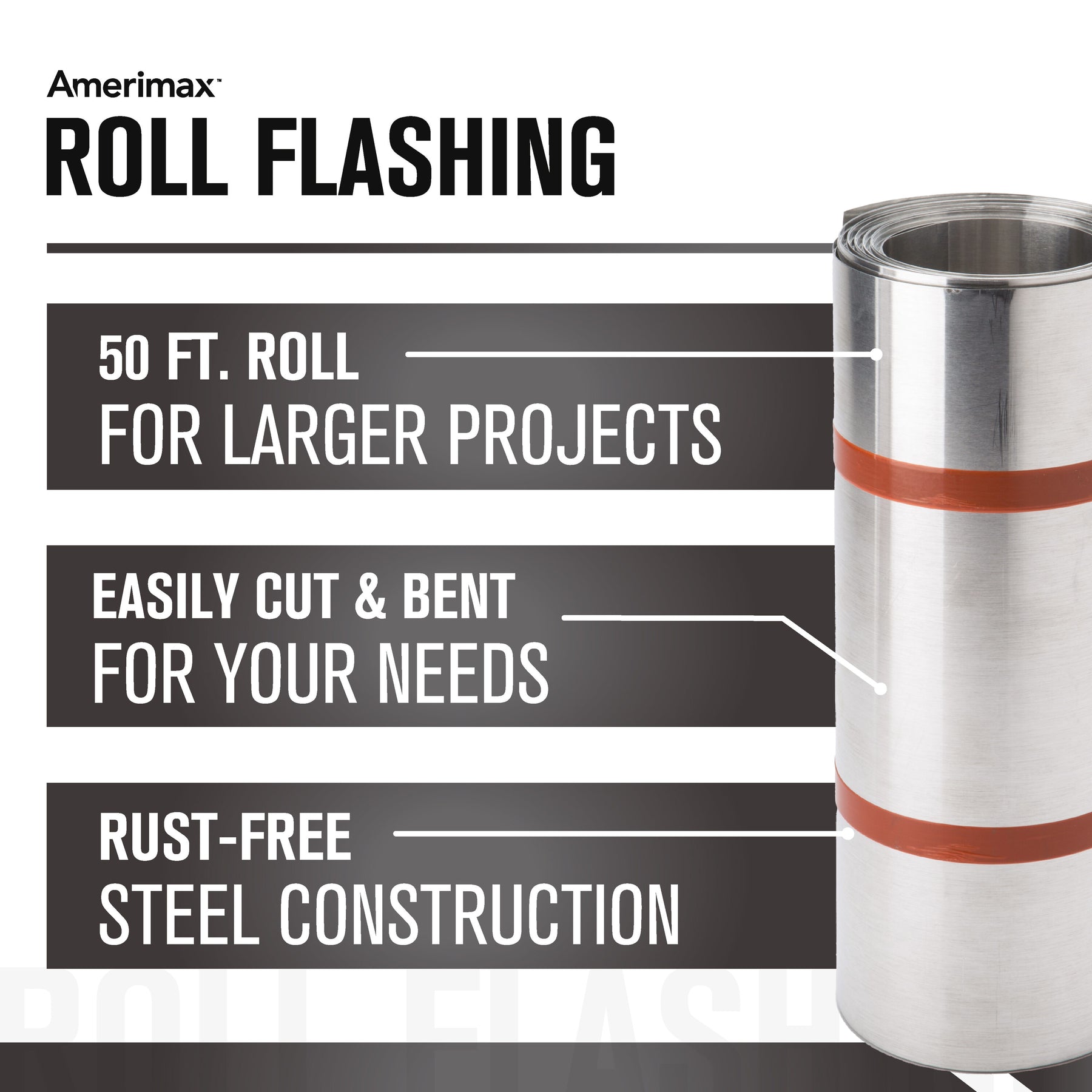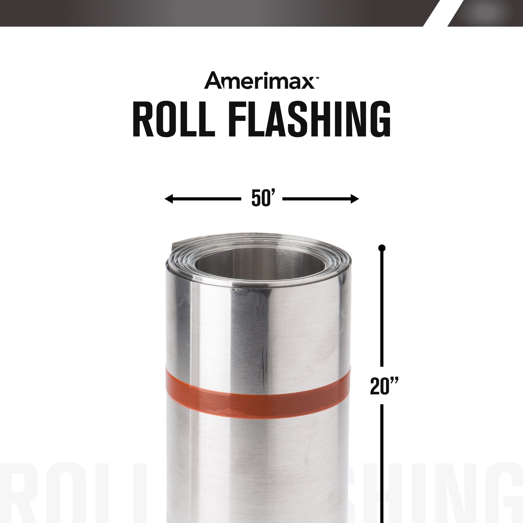 Durable Amerimax roll flashing made from galvanized steel for long-lasting weatherproofing. At 20 inches wide and 50 feet long, it’s ideal for creating custom flashings around chimneys, skylights, and wall transitions.
