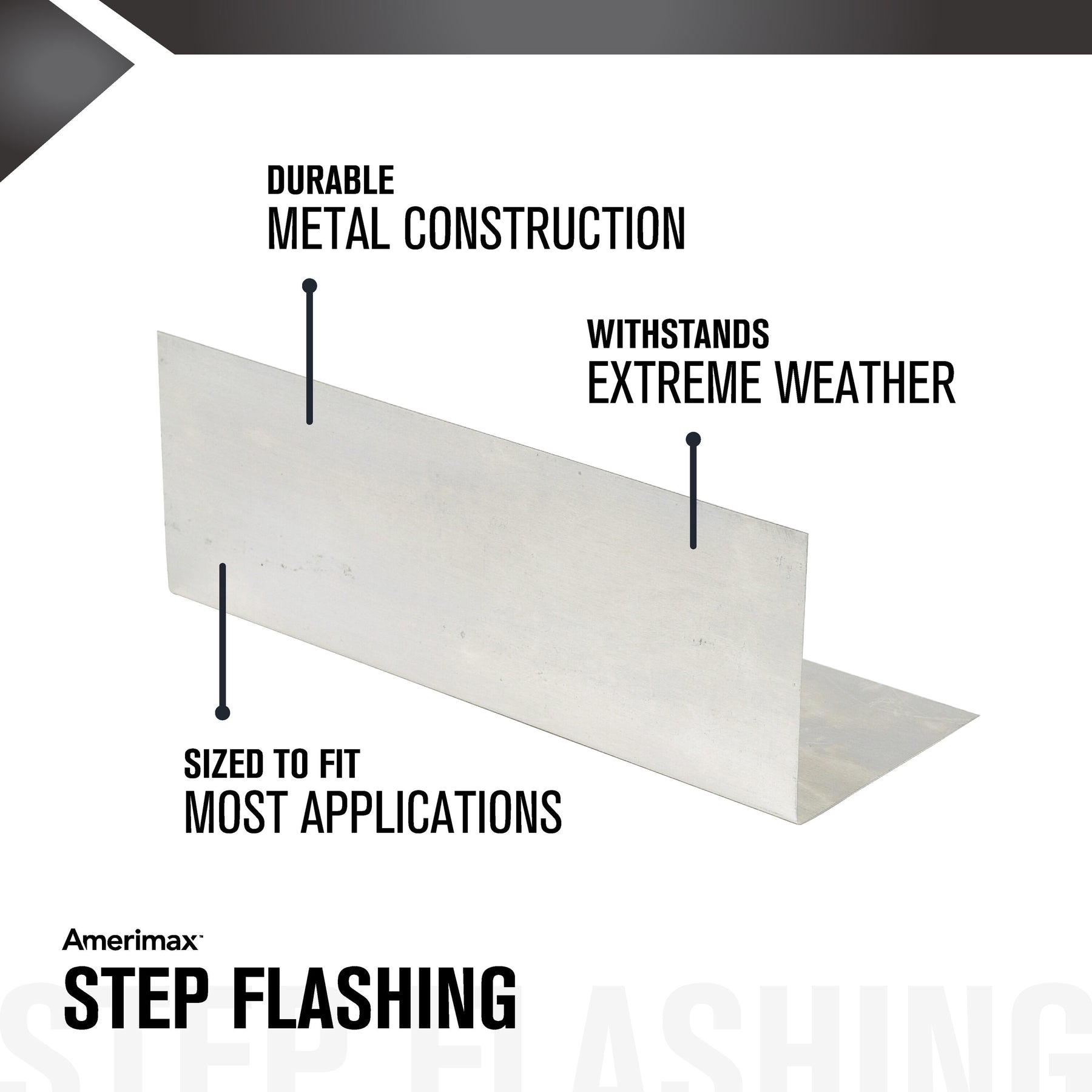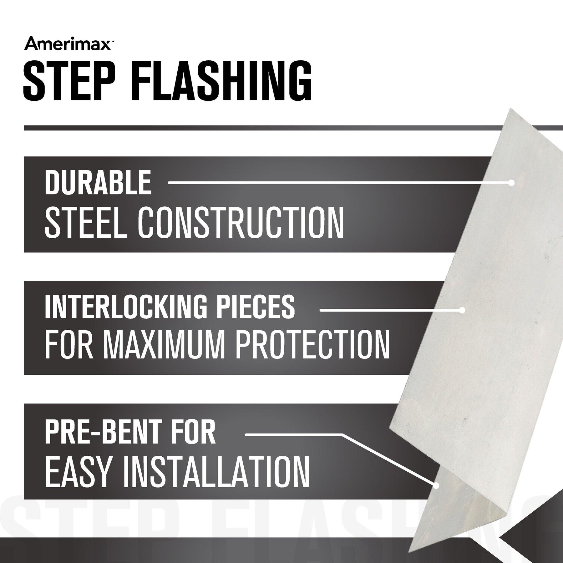 Pre-bent Amerimax step flashing made from galvanized steel for durable, weather-resistant protection at roof-to-wall transitions. Sized 4 in x 8 in to fit most applications around chimneys, skylights, dormers, and more.