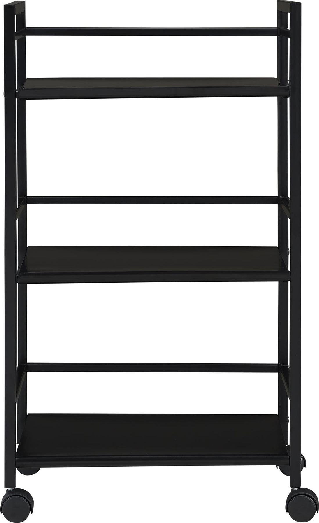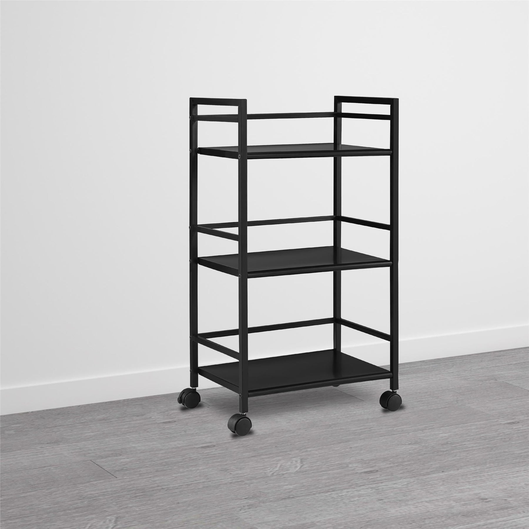 Optimize your kitchen space with the Ameriwood Home Black Rolling Kitchen Cart. Featuring three spacious shelves with protective wraparound bars and convenient locking wheels, this cart is both stylish and functional with a sleek black composite design. Ideal for kitchens or any room needing versatile storage, its minimalistic style seamlessly integrates with any decor.
