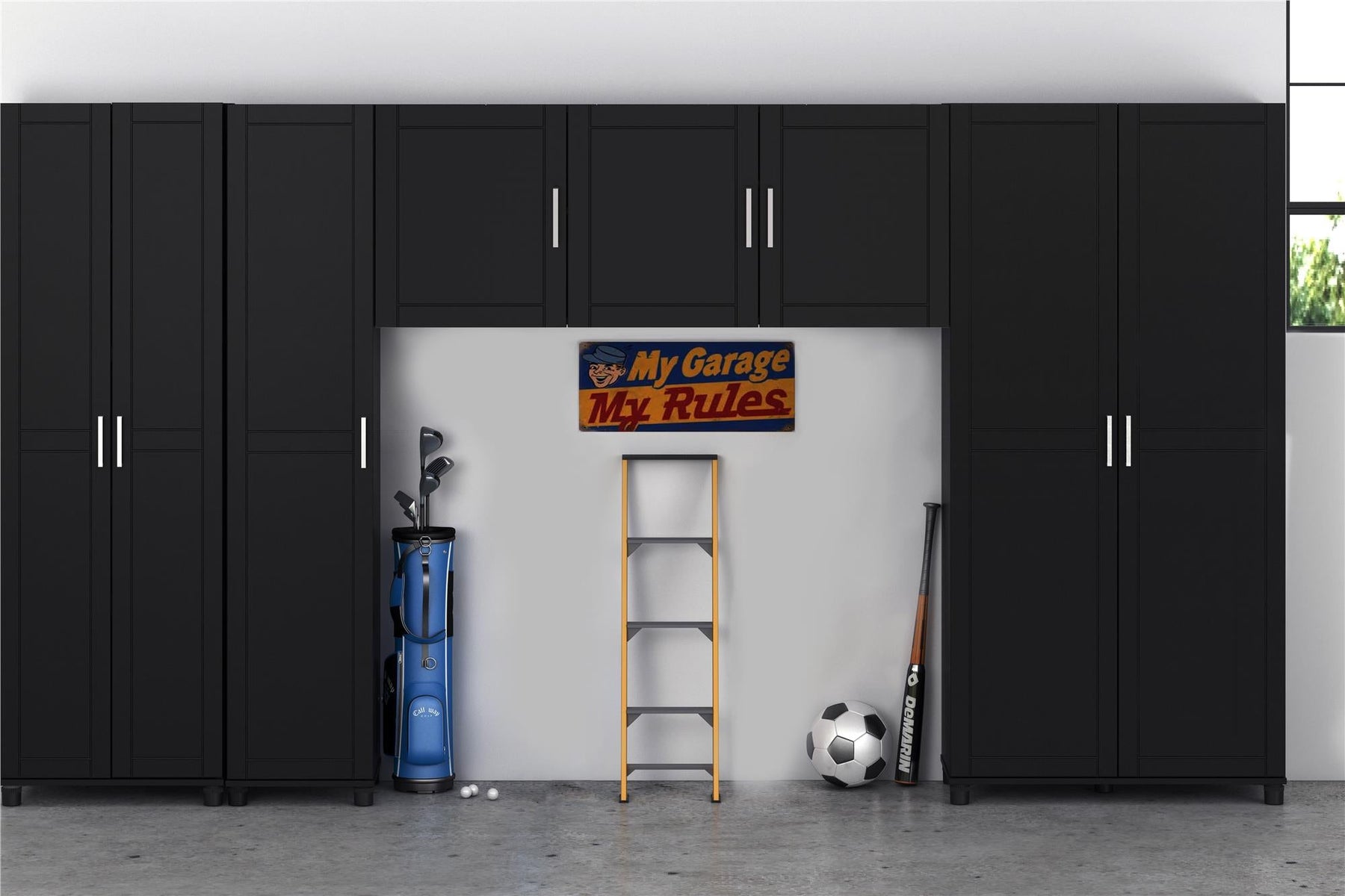 Optimize your garage or workspace with the Ameriwood Home Callahan Freestanding Garage Cabinet. Featuring a sleek black finish and durable composite wood construction, this cabinet adds both style and functionality. With soft-closing doors and a water-resistant design, it's a practical storage solution for your tools, equipment, and miscellaneous items.
