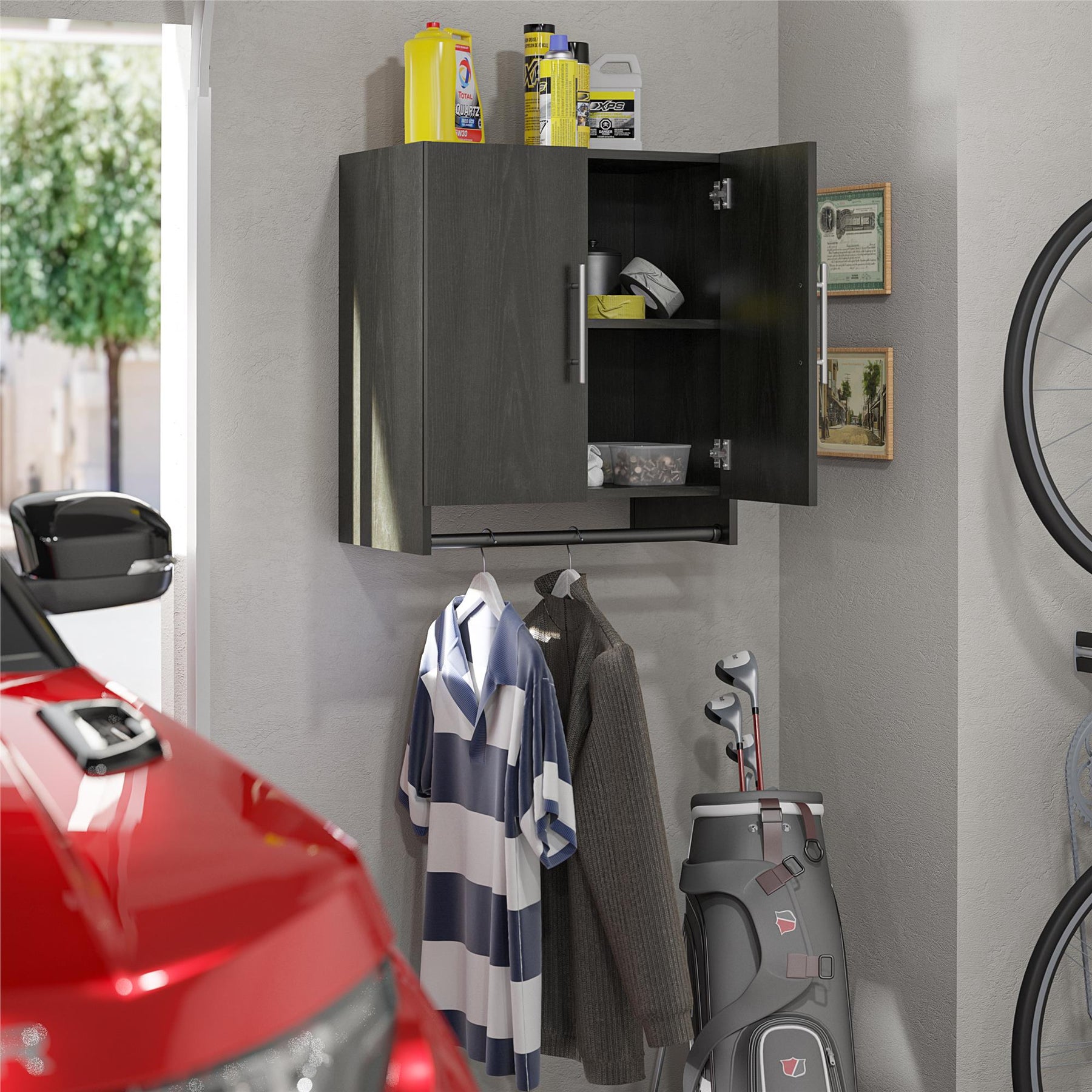 Transform your utilitarian garage space into a stylish extension of your home with the sleek Ameriwood Camberly Cabinet. Its sophisticated black finish and clean lines introduce a touch of contemporary allure, offering both aesthetic appeal and practical utility. The hidden gem here is the built-in clothing rod, perfect for air-drying work gear or hanging tools within easy reach. This cabinet is not just about storage; it’s about making a statement — seamlessly blending functionality with fashion to create a refined, organized sanctuary for everyday living.