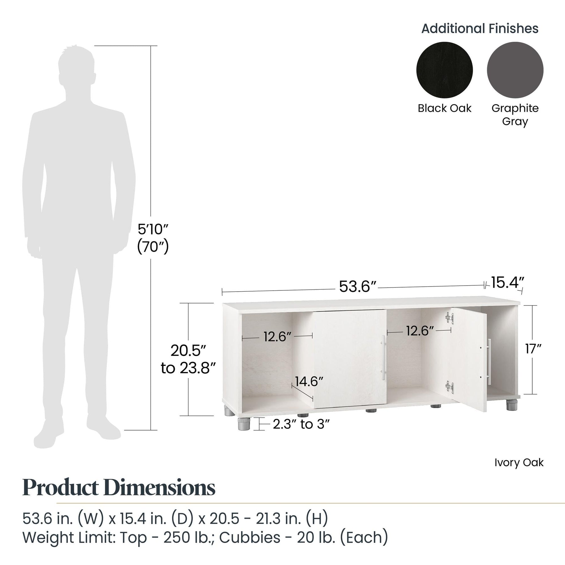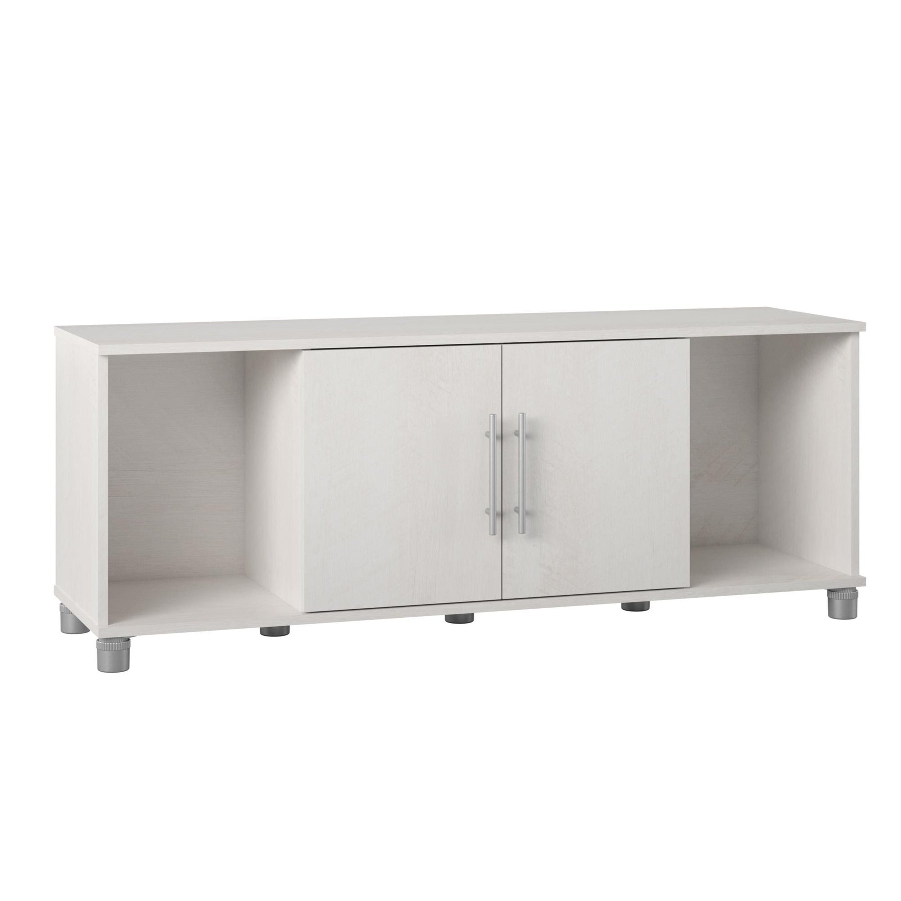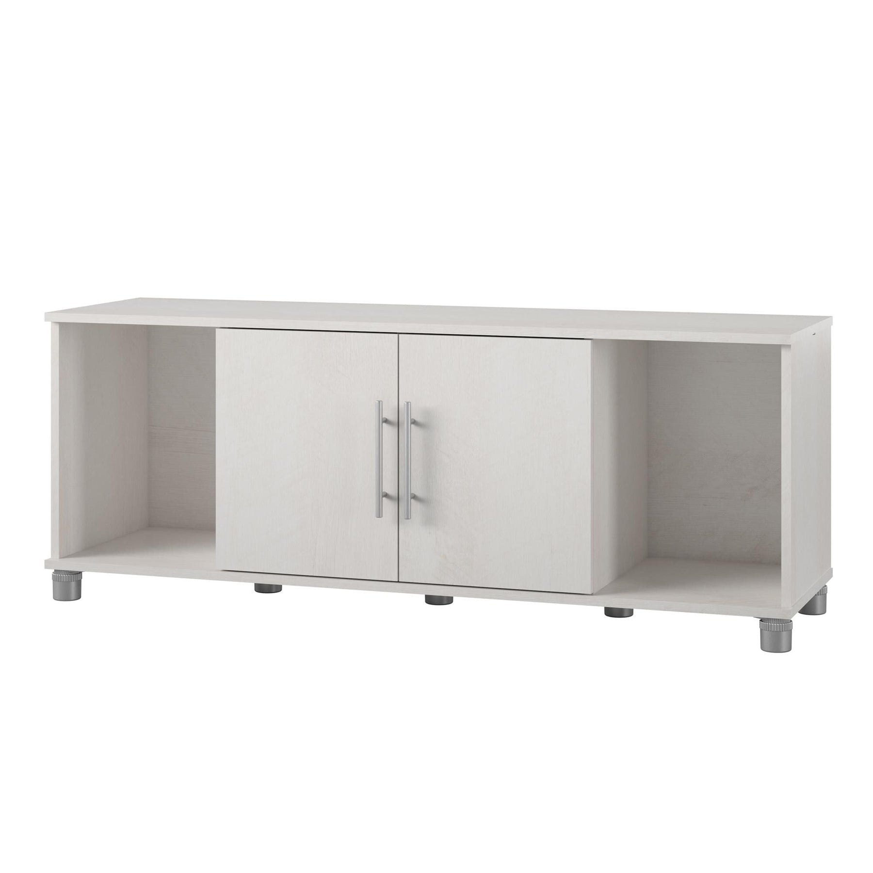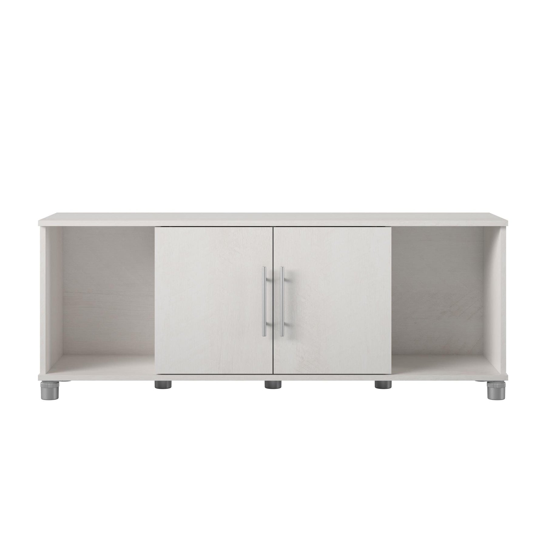 The Camberly Garage Cabinet by SystemBuild Evolution provides efficient storage in your garage or entryway with a stylish design. Made from durable laminated composite wood in a magnolia oak finish, it features adjustable feet for stability on uneven surfaces, and offers flexibility with open and closed shelves to organize shoes, bags, and more.