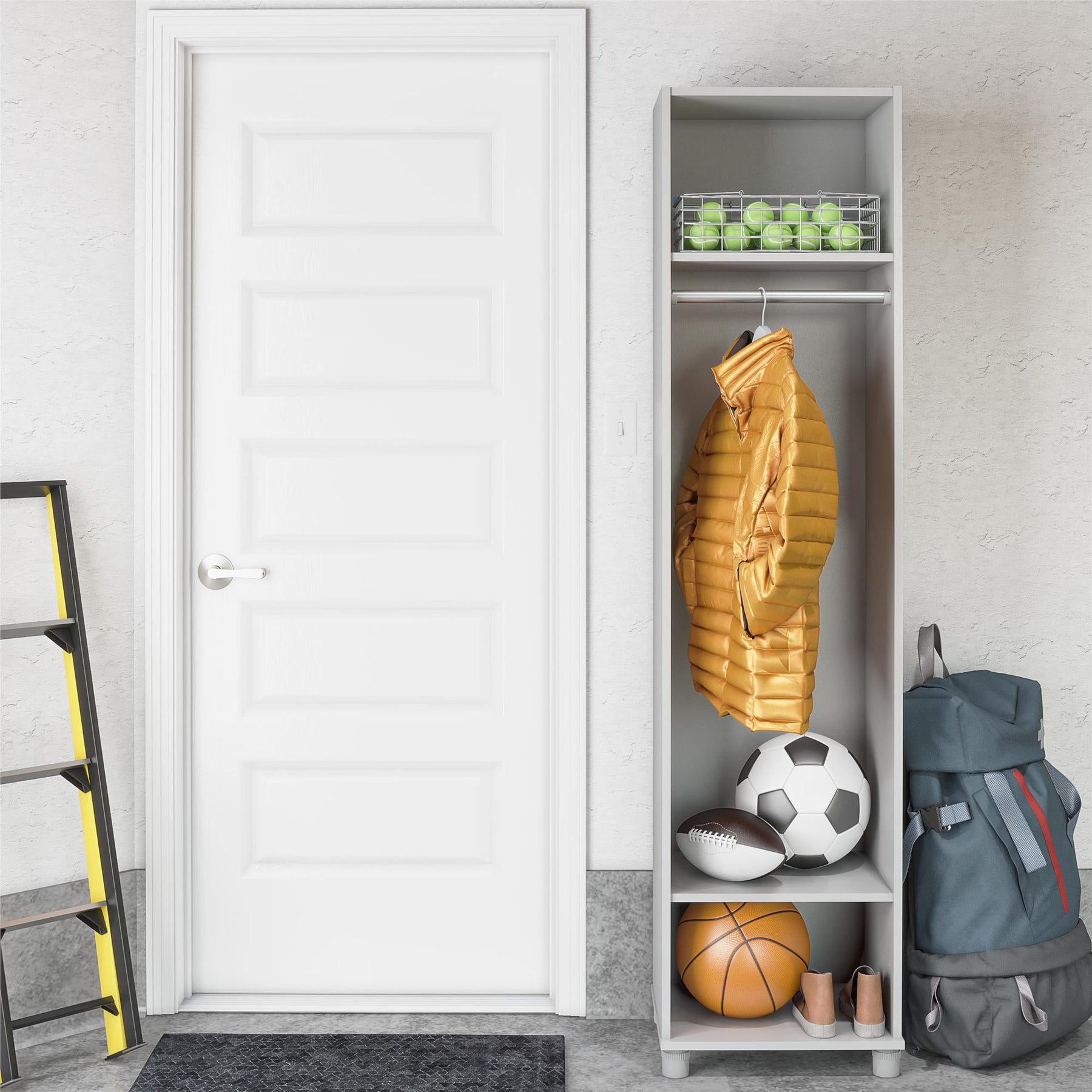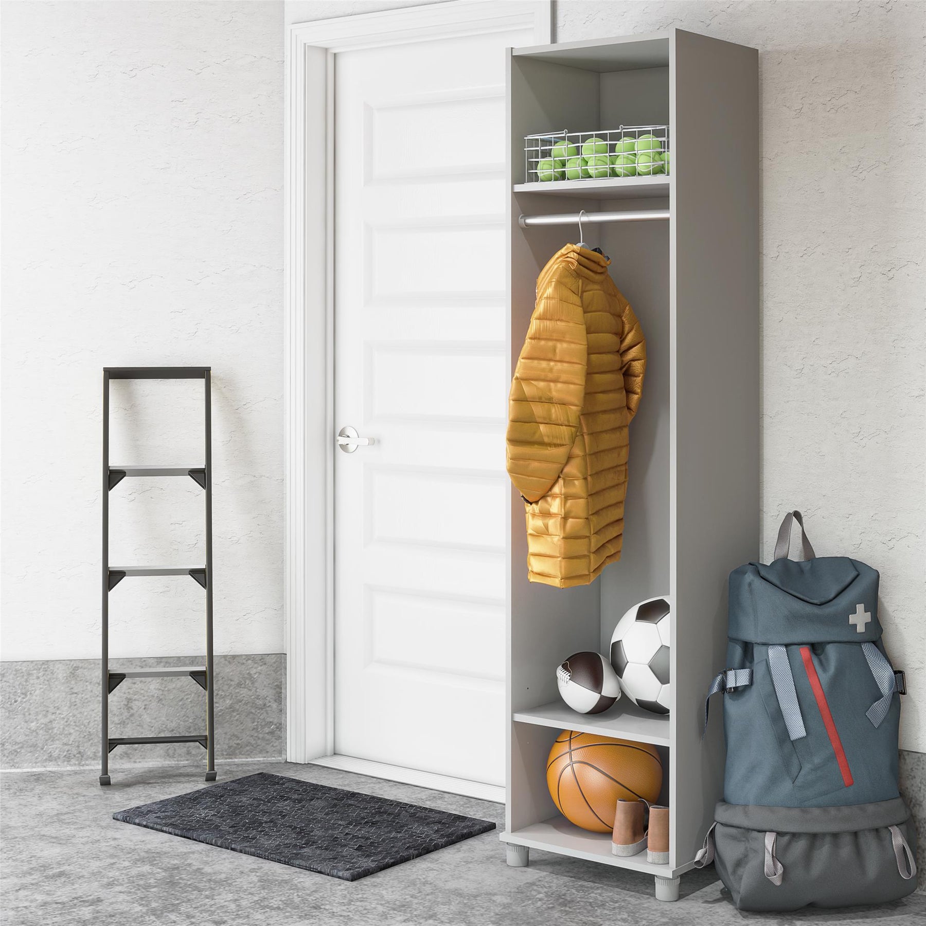 Streamline your space with the Ameriwood Home Lory Garage Cabinet, featuring durable composite wood and a sleek gray finish. This versatile storage solution offers adjustable shelving and a clothing rod, perfect for organizing coats and accessories in any room.
