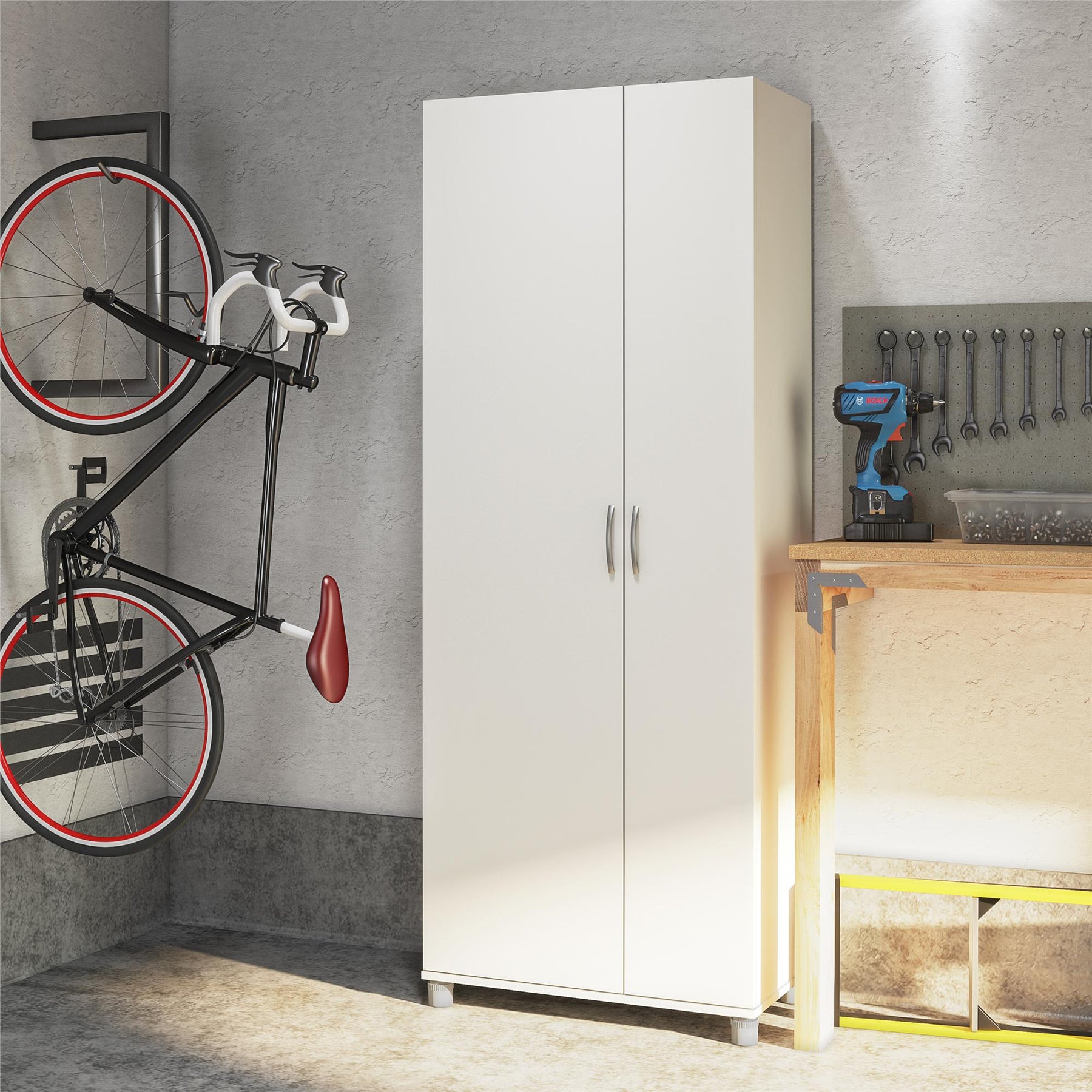 Maximize your storage space with the Ameriwood Home Lory Garage Cabinet. This freestanding cabinet, crafted from composite wood with a sleek white finish, is designed to organize any room affordably while enhancing its modern decor. With adjustable shelves and safety features like a wall anchor kit, this cabinet is both versatile and secure.