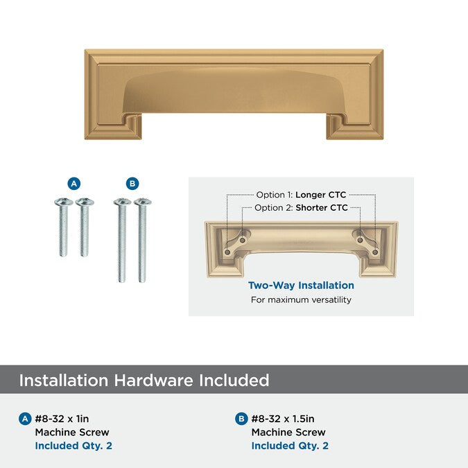 Q: How do I install the Appoint Cup Drawer Pull? A: The pull comes with included mounting hardware for easy installation onto furniture and cabinet doors with center-to-center distances of 3 inches or 3-3/4 inches.