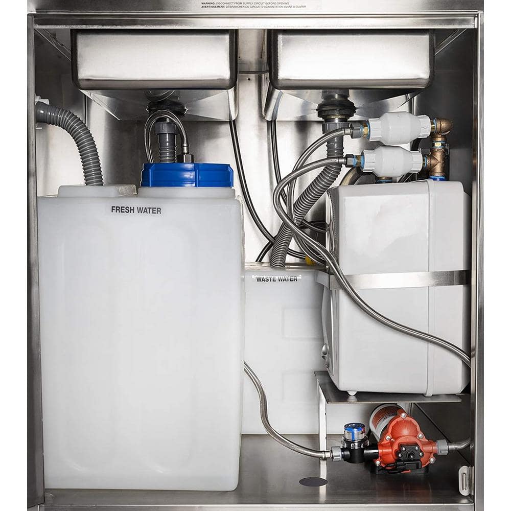 A: The sink has a 16-gallon freshwater tank and a 21-gallon wastewater tank, suitable for several uses before needing a refill or drainage.