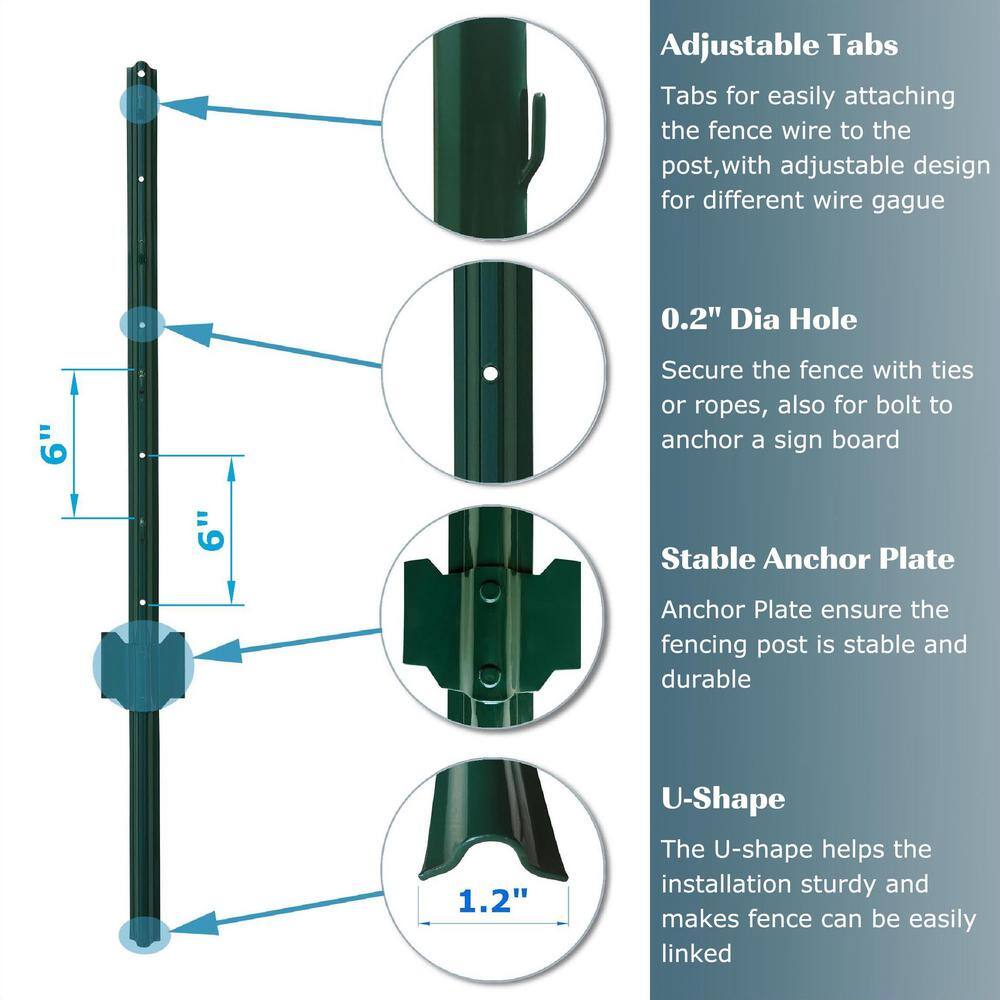 Q: What is the expected lifespan of these fence posts? A: Thanks to the green powder coating, the posts are resistant to rust and weather damage, offering a long-lasting solution for your fencing needs.