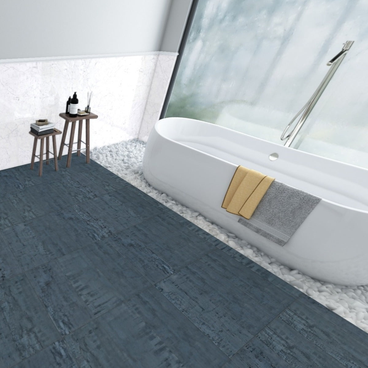 Transform your space with the industrial elegance of the Inspira Metallic Blue Porcelain Tile—order now to elevate your design.
