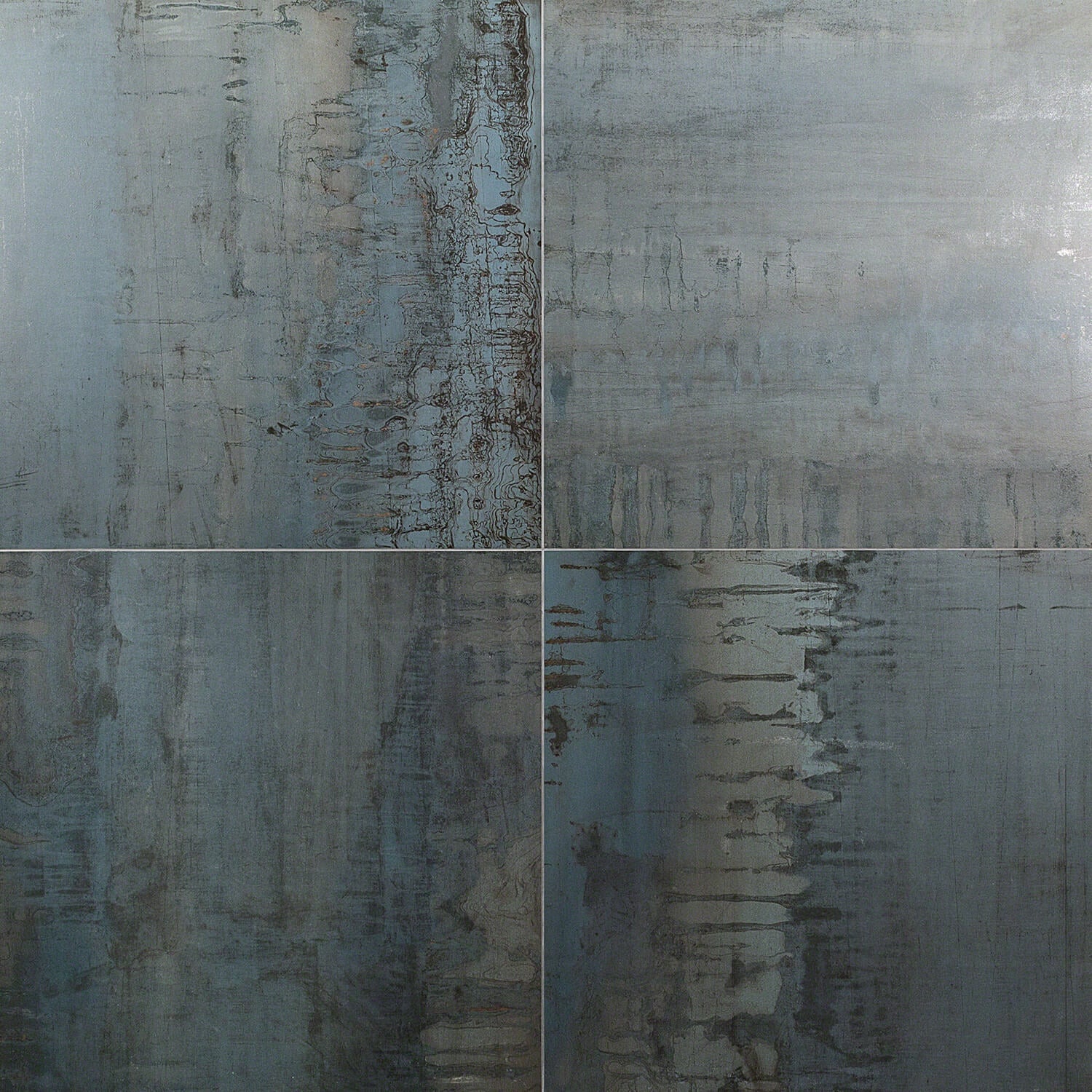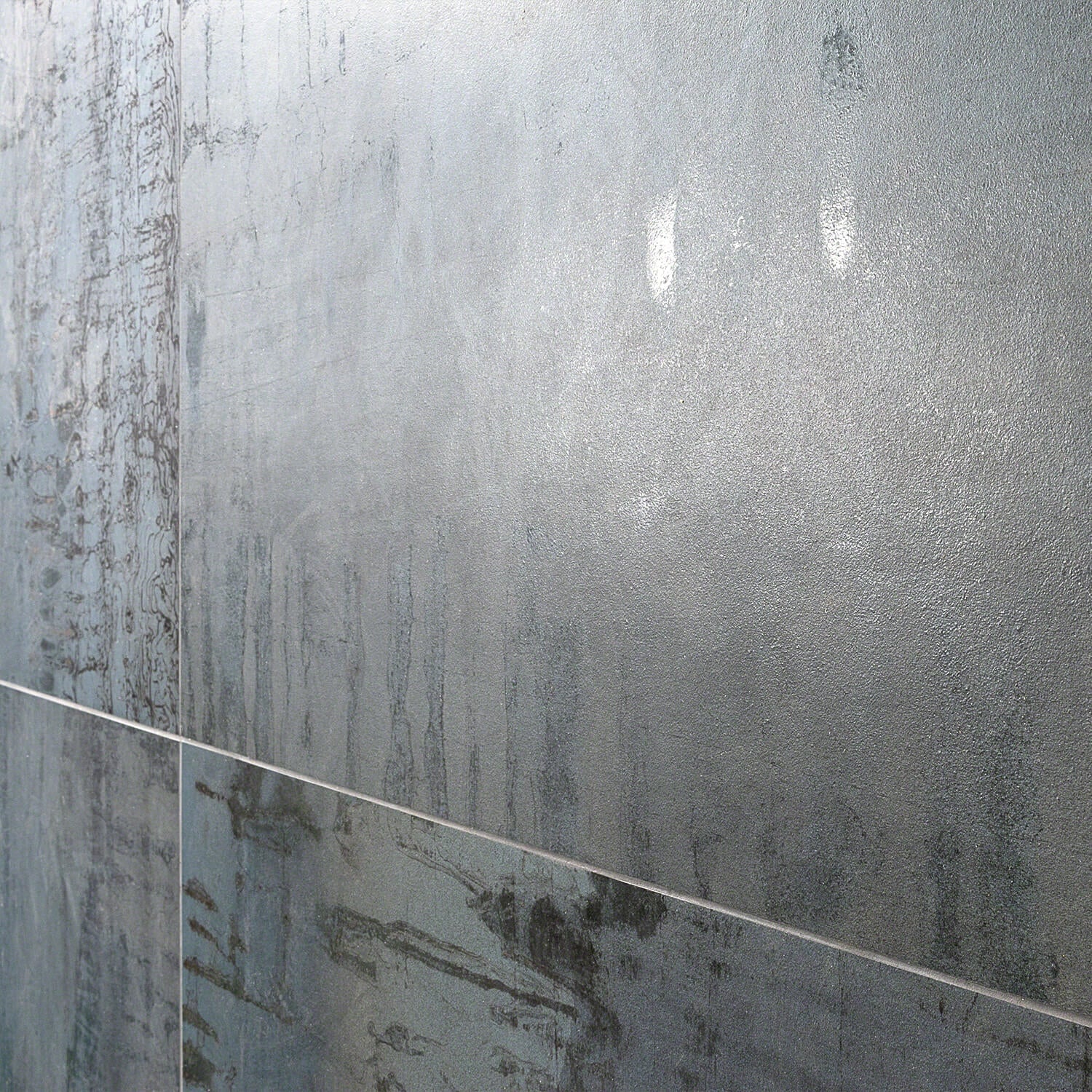 The Metallic Blue Matte Porcelain Tile, curated by Angela Harris, combines industrial design with a metallic blue-gray finish. Made in Italy, this tile offers a cement-like texture and a unique glaze for a sophisticated look.