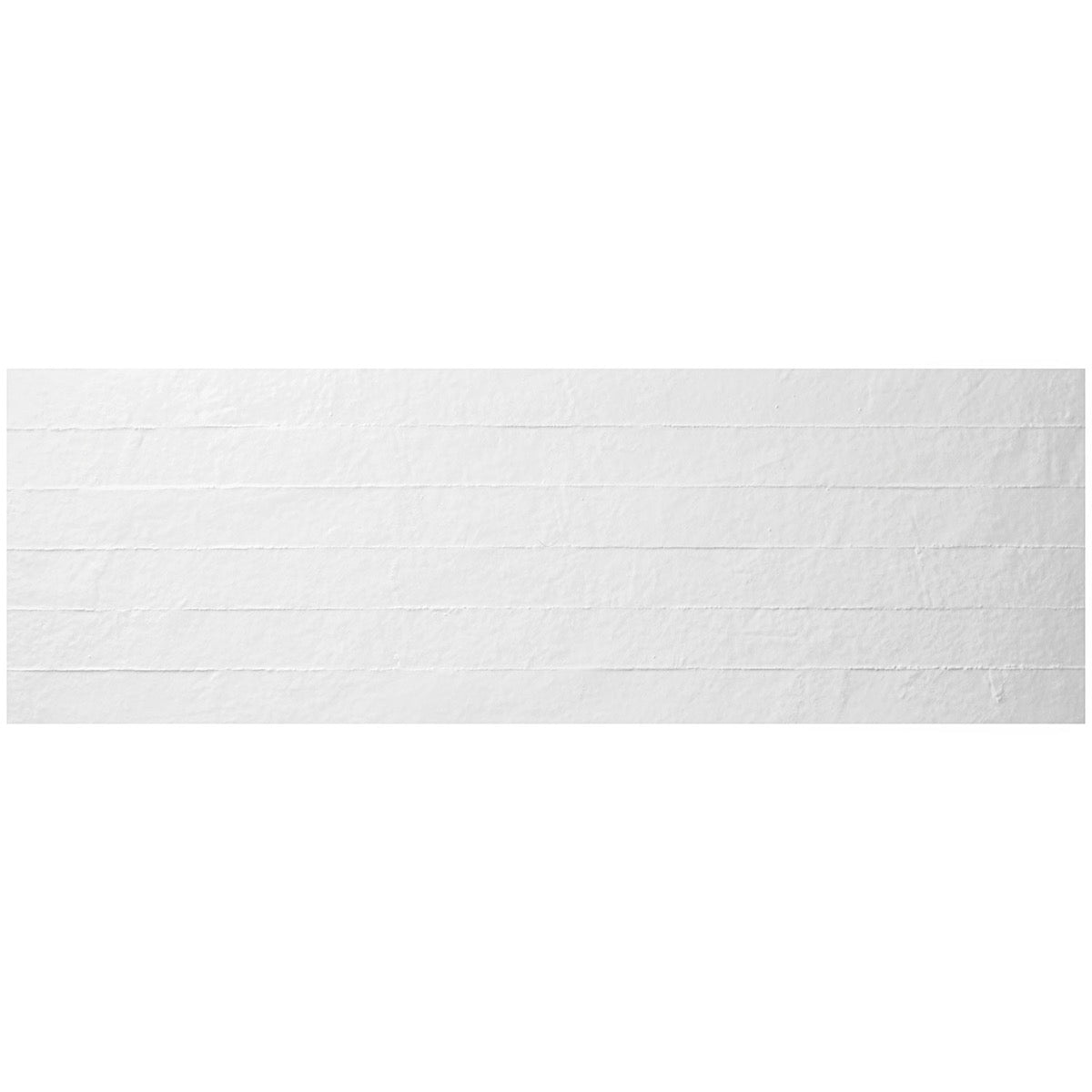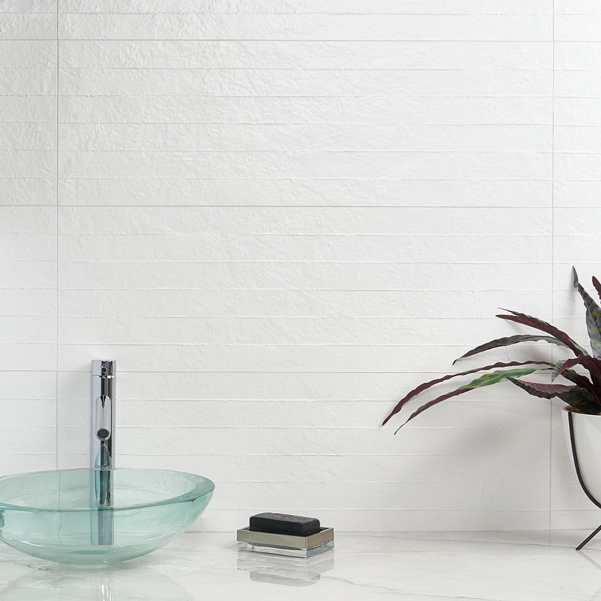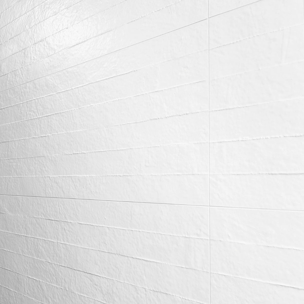 The Angela Harris Walsh Tobruk White Ceramic Tile features a matte finish and a stacked texture pattern, evoking the look of painted brick or concrete. Perfect for residential and commercial wall applications, this tile adds depth and dimension to any space.
