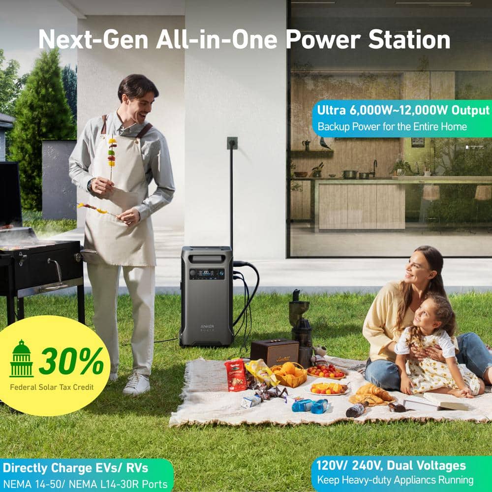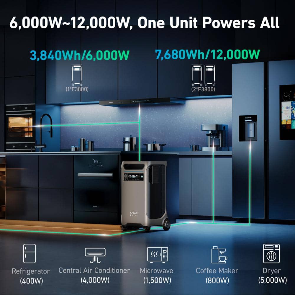 The Anker SOLIX F3800 Power Station is a robust, all-in-one solution for home and RV emergency power needs. With its massive 6,000W output and 9,000W peak power, it can easily handle heavy-duty appliances. Its dual-voltage capability and solar compatibility make it versatile and eco-friendly, ensuring you're never left in the dark.