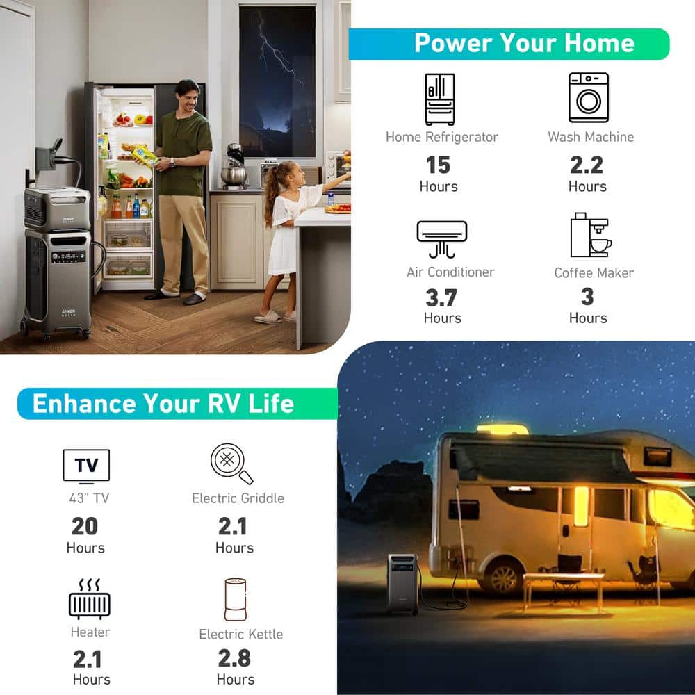 Q: Can it power large appliances like a washing machine or air conditioner? A: Yes, the SOLIX F3800 features dual-voltage and can power 120V/240V heavy-duty appliances such as washers and air conditioners.