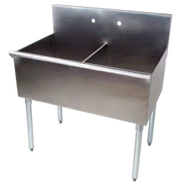 The Aoibox 36 x 24 in. Stainless Steel Utility Sink features dual 18 x 21 x 14 in. basins, crafted from durable 16-gauge type 430 stainless steel, ideal for comprehensive use in commercial or home settings. Its freestanding design with galvanized steel legs offers flexible placement, while the pre-drilled holes and removable drain basket ensure easy installation and maintenance.