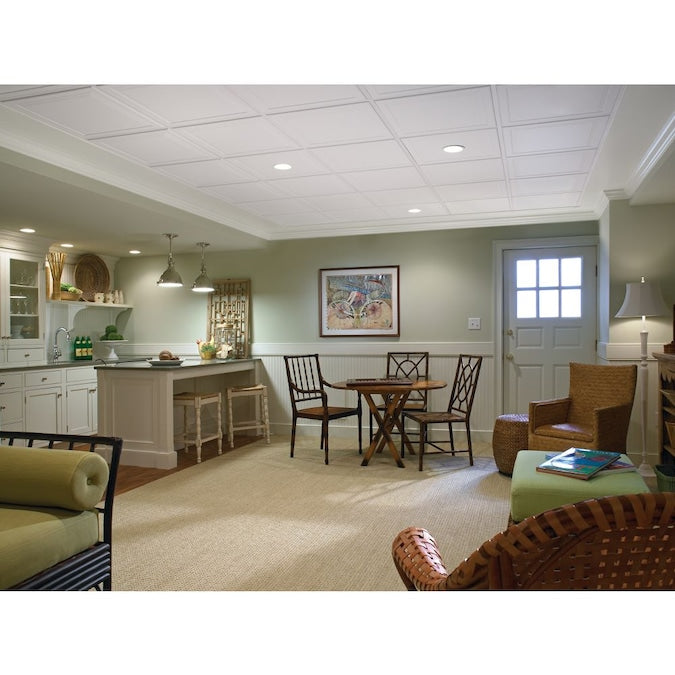 Transform your room with the understated opulence of Armstrong's Raised White Ceiling Tiles. Their sophisticated coffered design invites a sense of depth and spaciousness, while the seamless grid integration underscores modern refinement. Envision these tiles above a contemporary mantelpiece, where they enhance natural light play and acoustics, creating a tranquil and inviting ambiance. Essential for any luxurious living space, these tiles embody elegance and functionality effortlessly.