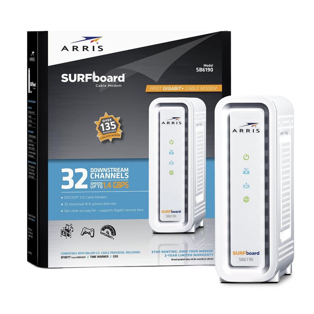The ARRIS SURFboard SB6190 cable modem unleashes ultimate internet speeds up to 1.4 Gbps, perfect for HD streaming and gaming. Designed with DOCSIS 3.0 technology, it provides a reliable and lightning-fast connection for all your devices. Its plug-and-play setup ensures easy installation and maximum internet performance.