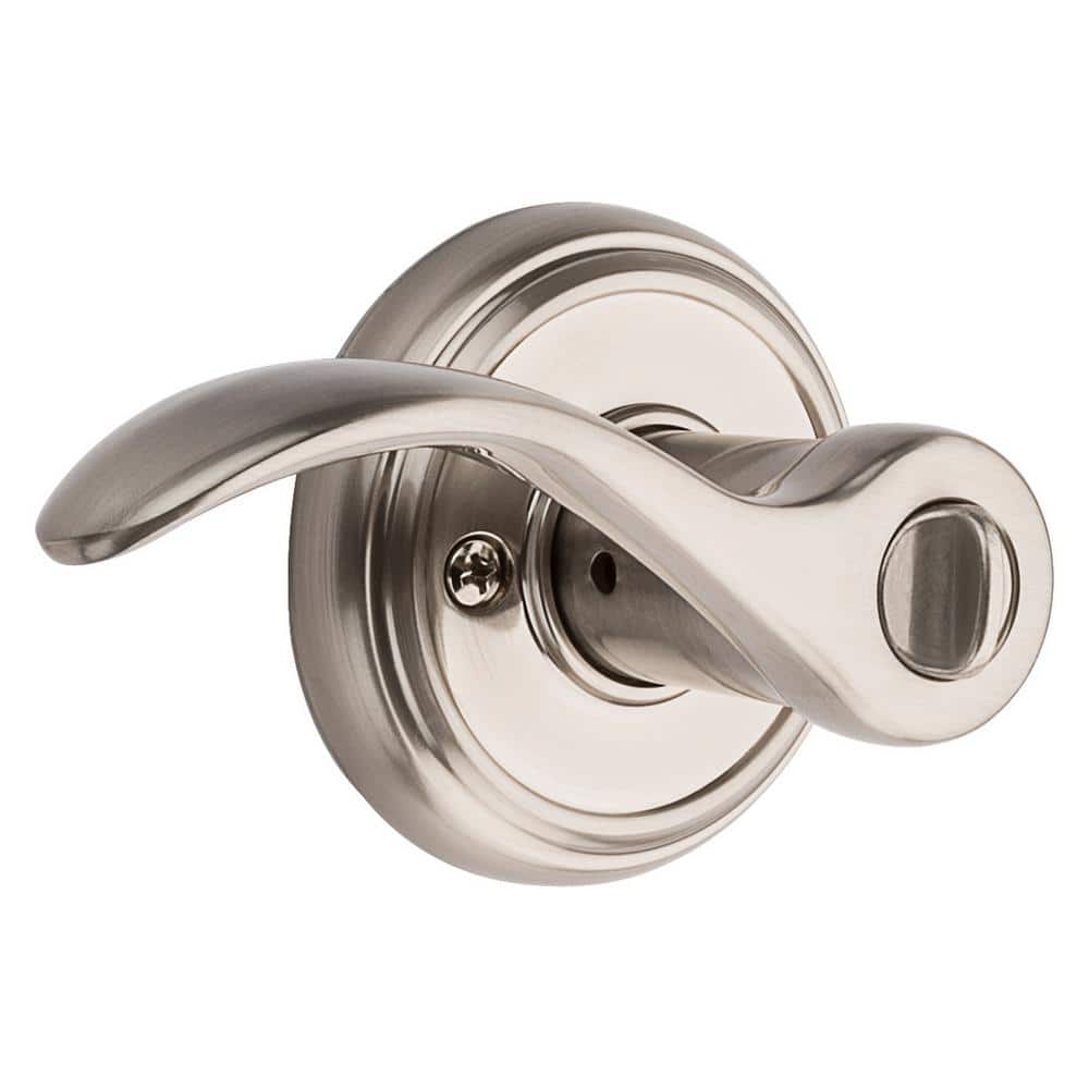 Secure your exterior door with the Baldwin Prestige Tobin lever featuring SmartKey Security. The satin nickel finish and classic round rose pair with a wave-style lever for a refined look, while the re-key technology lets you rekey in seconds to match your existing KW1 key.