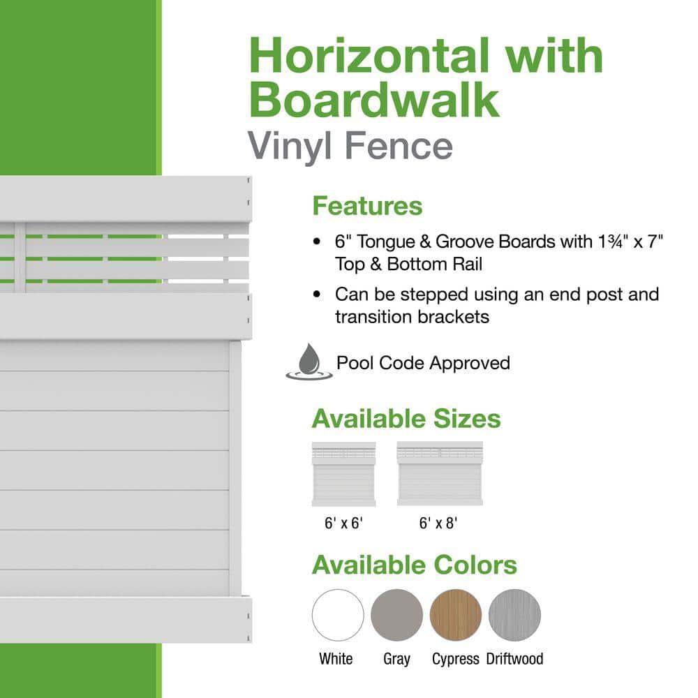 Transform your outdoor space with the Barrette Outdoor Living Horizontal Boardwalk 6x8 Cypress Semi-Privacy Vinyl Fence Panel. Featuring a contemporary design with horizontal infill boards and a decorative screen panel, this low-maintenance fencing solution offers elegant privacy while boosting curb appeal.