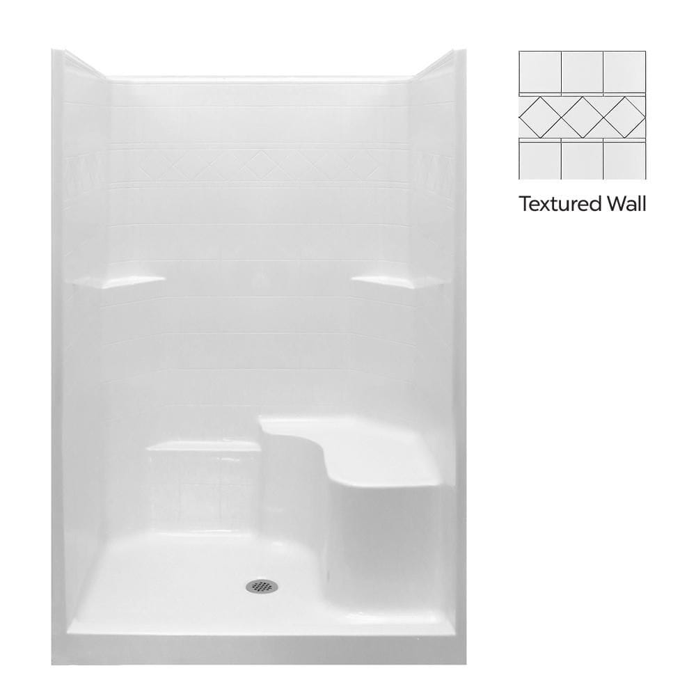Features Built-in shower seat; shelves; slip-resistant floor; simulated tile wall pattern