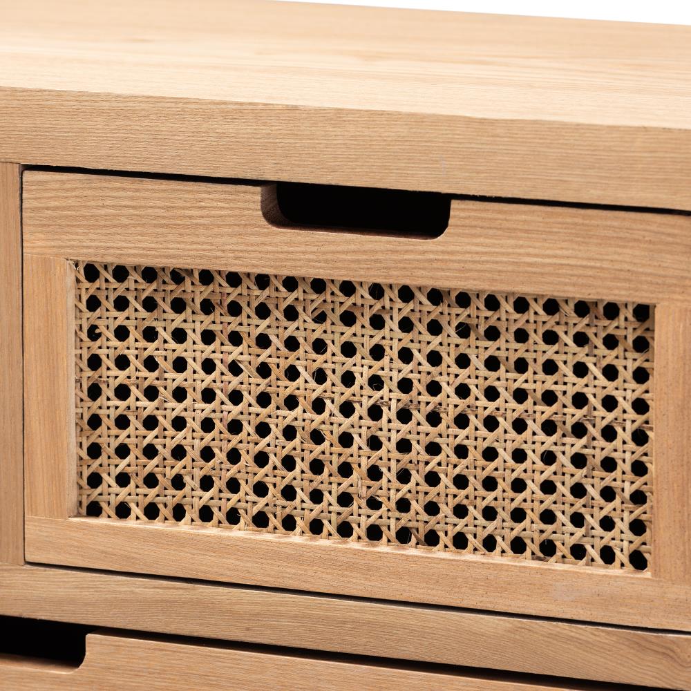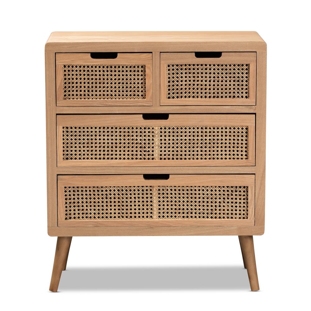 The Alina Medium Oak Fir 4-Drawer Accent Chest by Baxton Studio combines retro charm with functional storage. Crafted from MDF wood, fir wood, and rattan, this chest features a warm medium oak finish that complements various interior styles. With its four spacious drawers and unique cut-out handles, this piece offers both style and practicality for your living space.