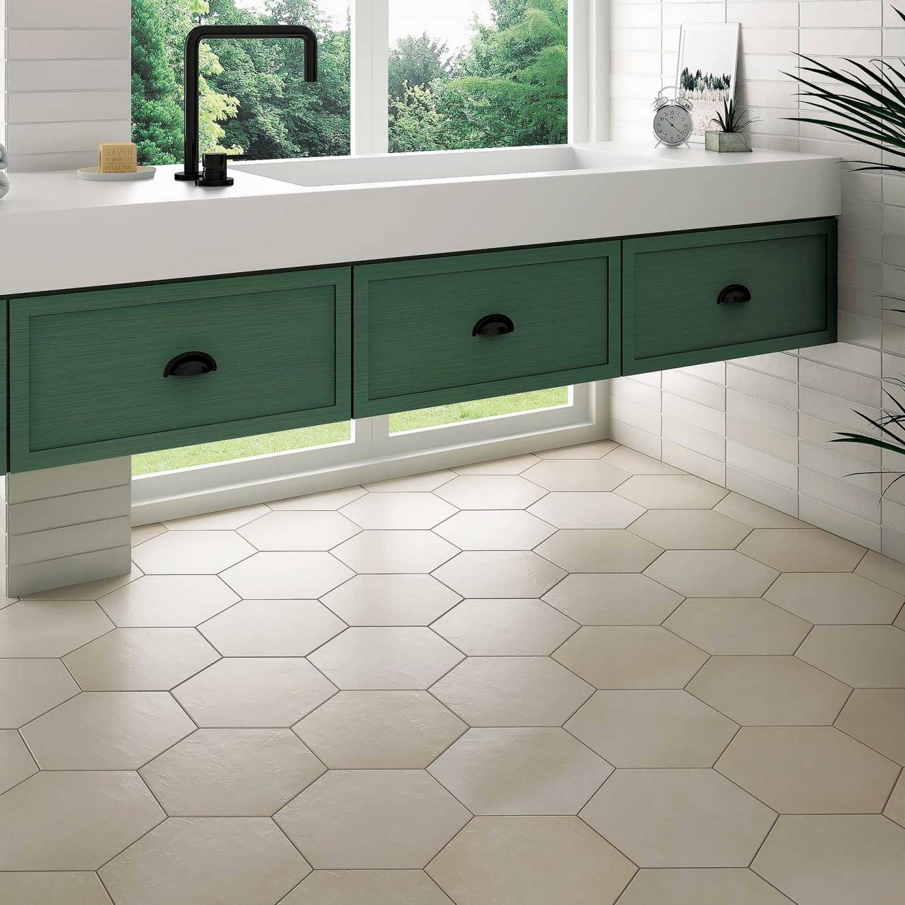 Hexagon Format: 10" x 11" geometry creates dynamic patterns on floors and walls