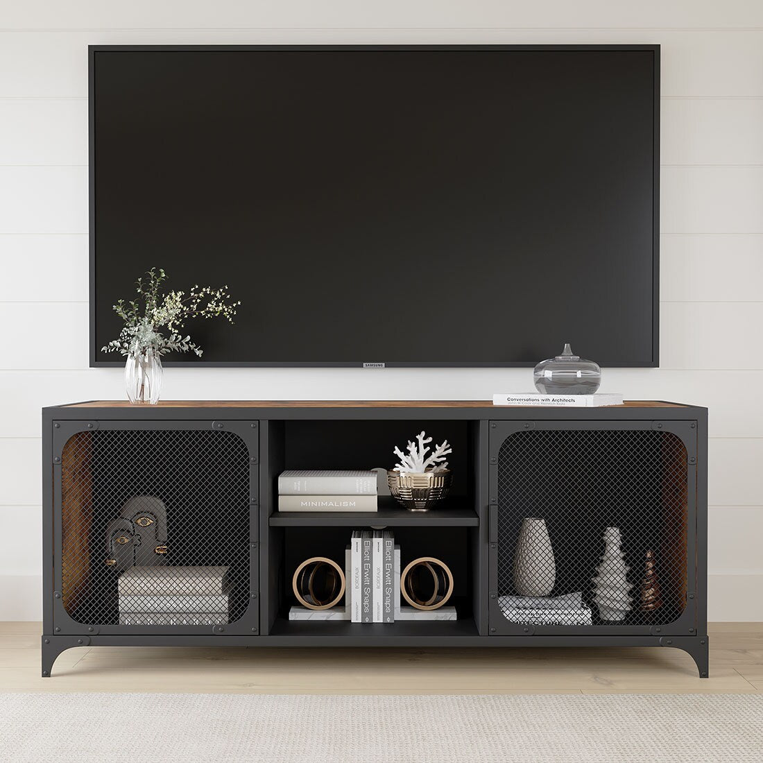 Elevate your living space with this media cabinet that embodies chic sophistication and rugged charm. The sleek black and rustic finish, coupled with mesh-paneled doors, adds a distinct character to any room it graces. Envision it nestled against a neutral wall, highlighted by ambient lighting that enhances its mesh detail. Not only does it serve as a tranquil backdrop for your media essentials, but its contemporary allure also makes it a statement piece in a sophisticated home.