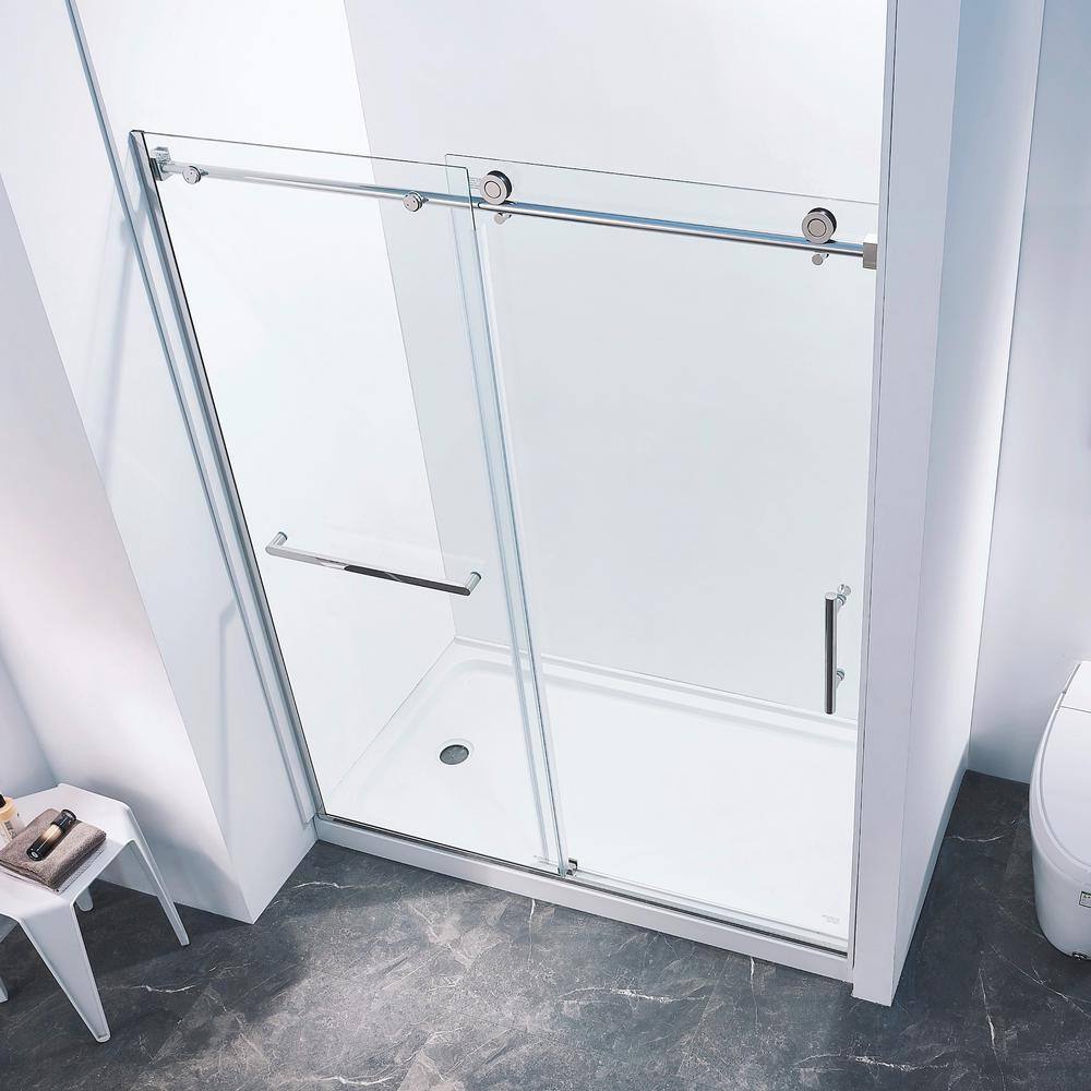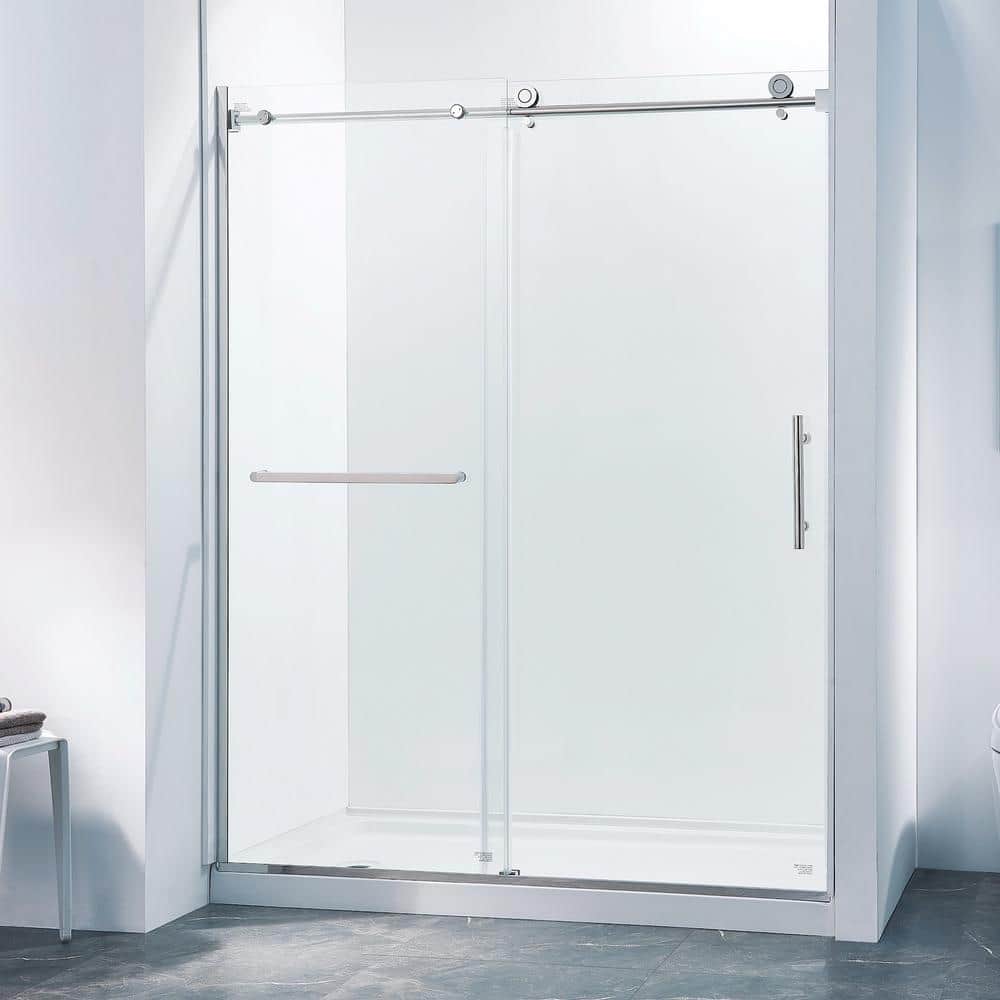 Elevate your bathroom with the Boosicavelly Single Sliding Shower Door, featuring robust tempered glass and a sleek chrome finish. This semi-frameless design offers a minimalist look while maximizing space with its smooth, quiet operation and convenient towel bars.
