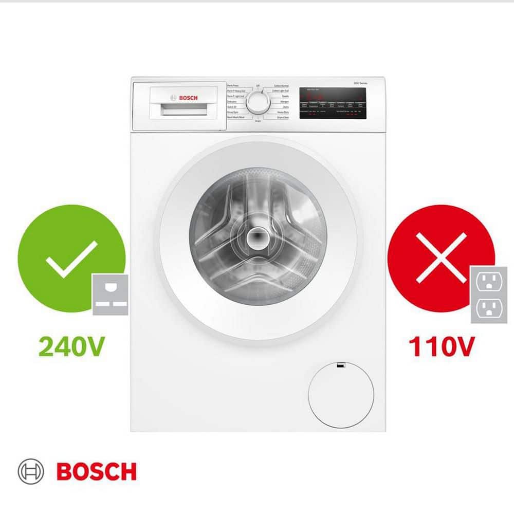 A: This washer requires a 240V NEMA 6-15 outlet or connection via Bosch dryer adapter; it does not run on standard 110V.