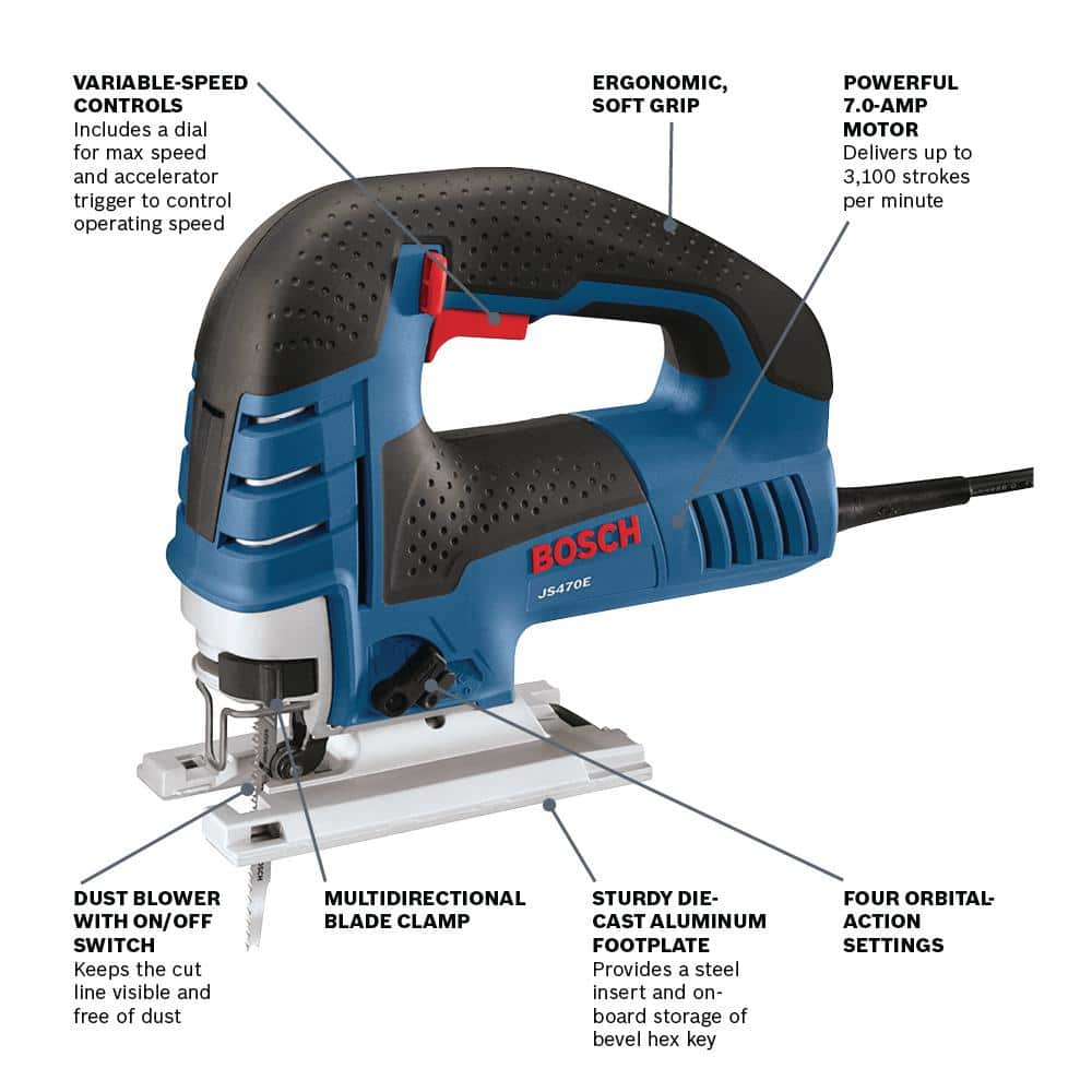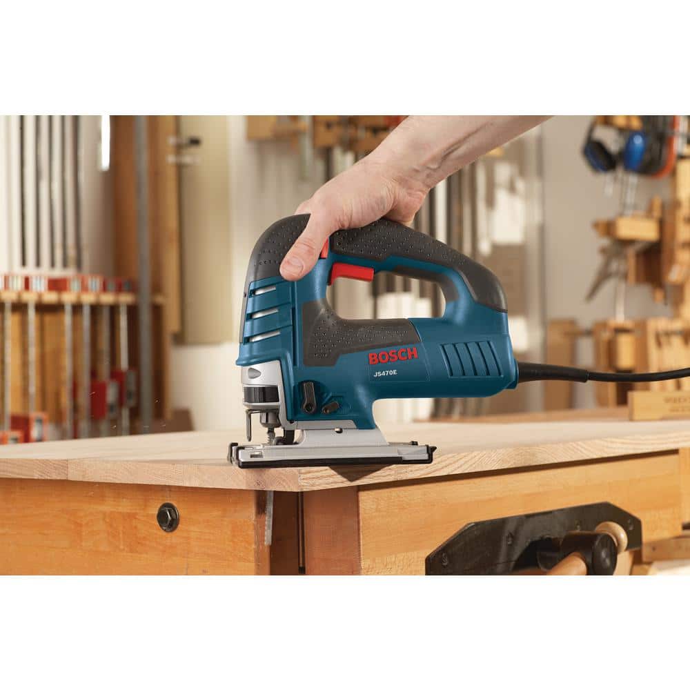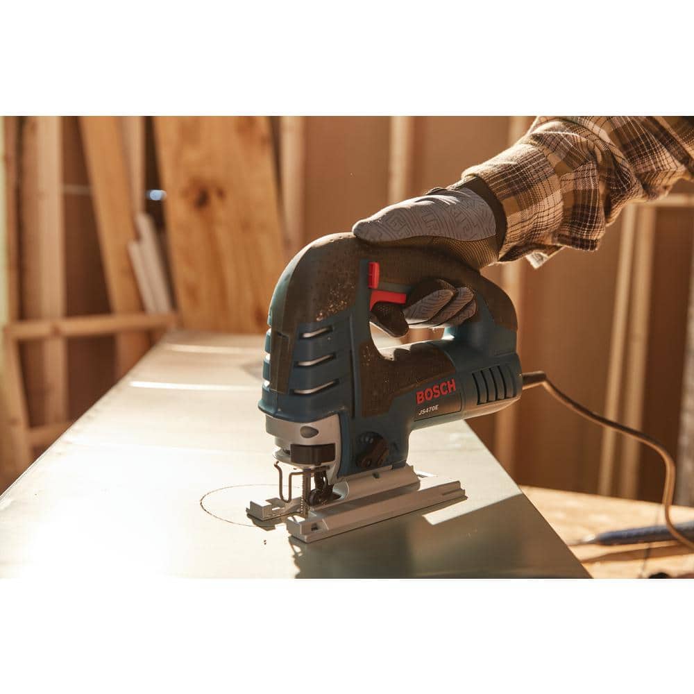 The Bosch JS470E 7.0 Amp Top-Handle Jig Saw delivers precision and power with a low-vibration plunge design and variable-speed control, making it a superior choice for professionals engaged in ambitious curve-cutting projects. Equipped with a durable aluminum gearbox and enhanced by a comfort-oriented top handle, this jig saw is engineered to provide smooth, consistent cuts through wood and metal with ease.