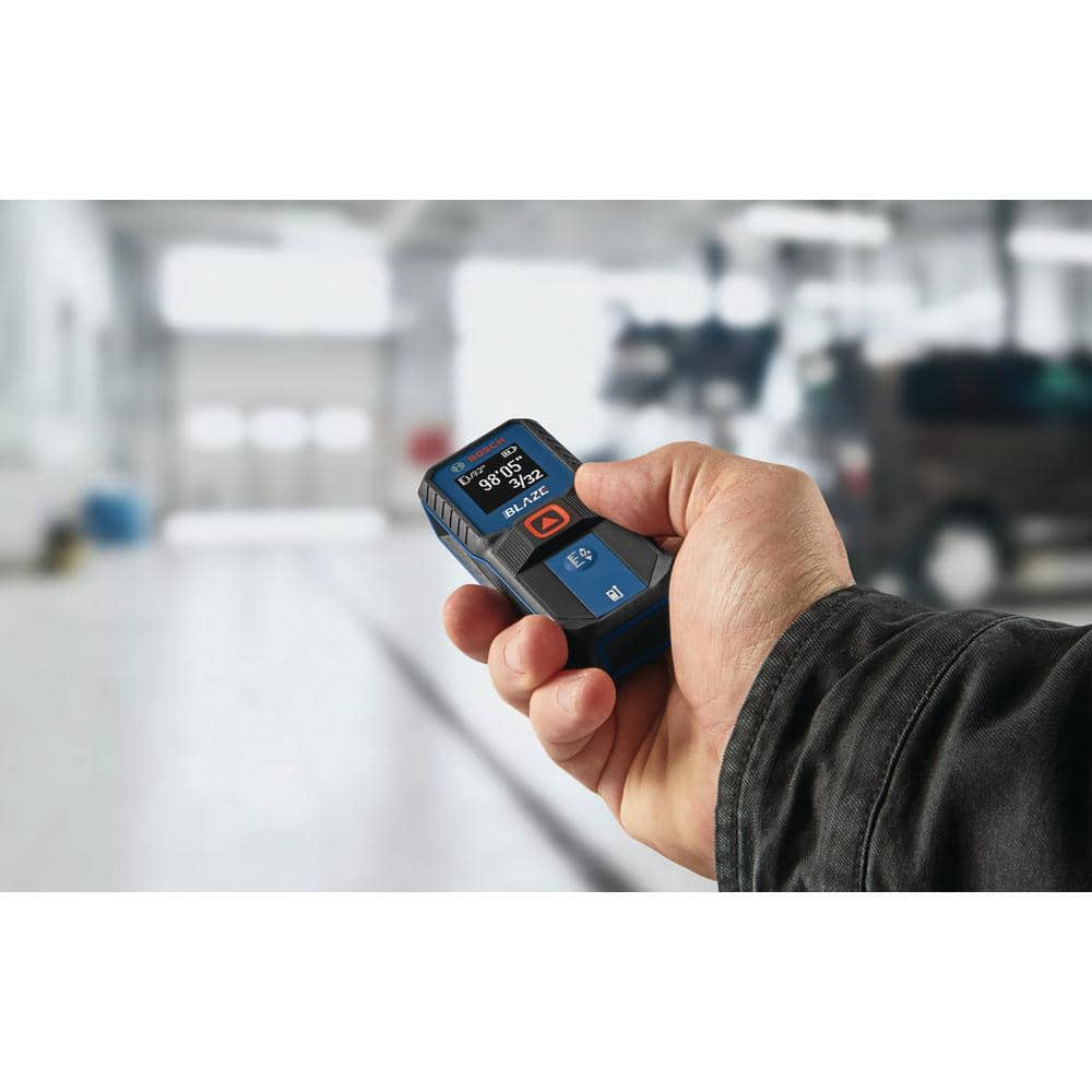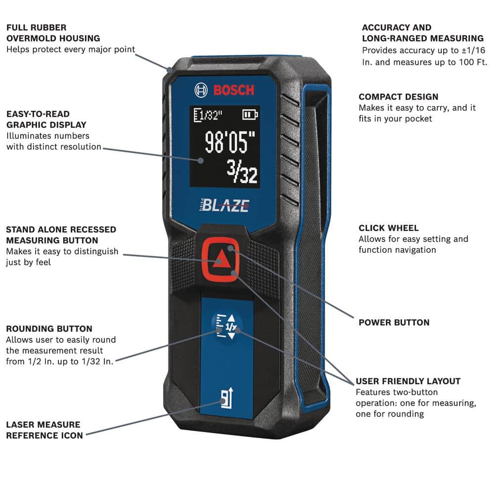 Experience precision and convenience with the Bosch BLAZE 100 ft. Laser Measure. Equipped with a brighter graphic display and intuitive interface, this tool effortlessly handles tasks in both low-light and regular conditions. Perfect for pros and DIYers, its compact size and durable build make accurate measuring a breeze.