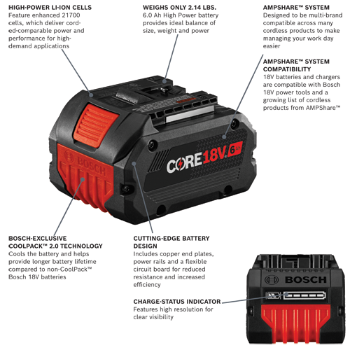 The Bosch CORE18V 6 Ah High Power Battery delivers up to 75% more power and 50% more runtime than the CORE18V 4 Ah pack. Built with enhanced 21700 cells and CoolPack 2.0 thermal management, it stays cooler for longer life and drives high-demand PROFACTOR tools.