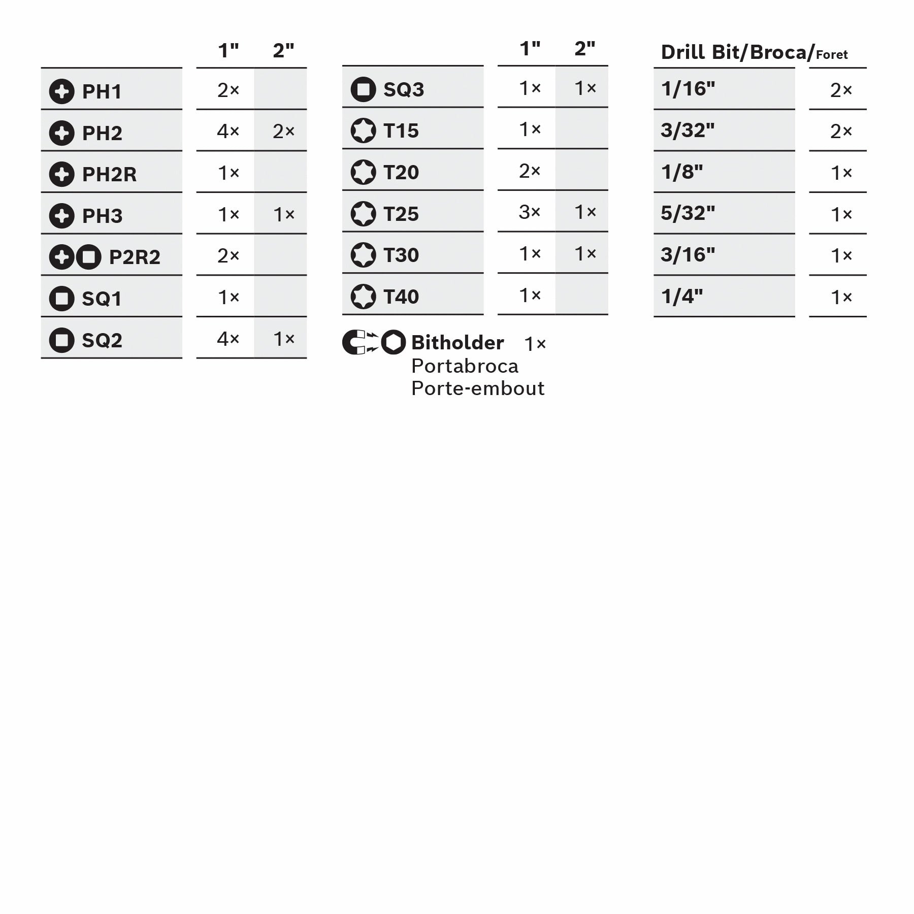 Q: What sizes are included? A: Driver bits include Phillips, Square, and Torx in assorted 1-in and 2-in lengths; drill bits include 1/16, 3/32, 1/8, 5/32, 3/16, and 1/4 in, plus a bit holder.
