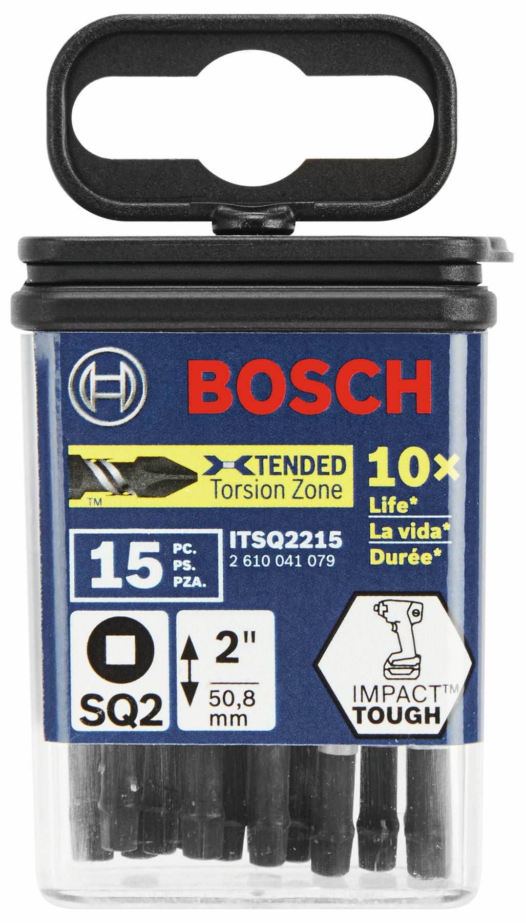 Bosch Impact Tough SQ2 driver bits are engineered for high-torque impact drivers, delivering up to 10X life over standard bits. The 2-in bits feature an Xtended Torsion Zone, hardened core, and precision tips for durable, cam‑out‑resistant fastening.