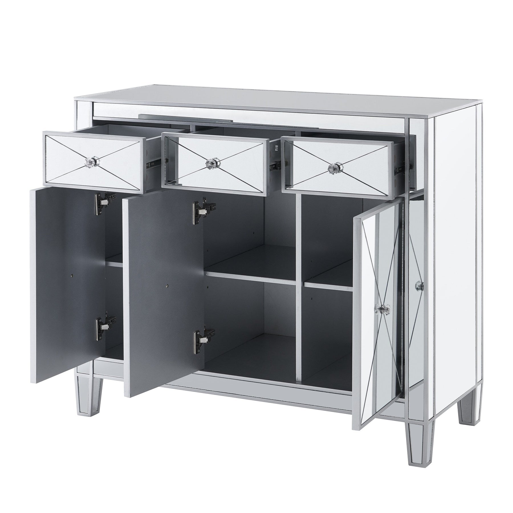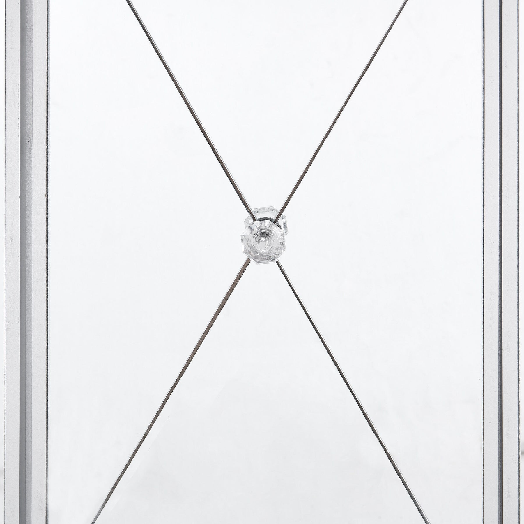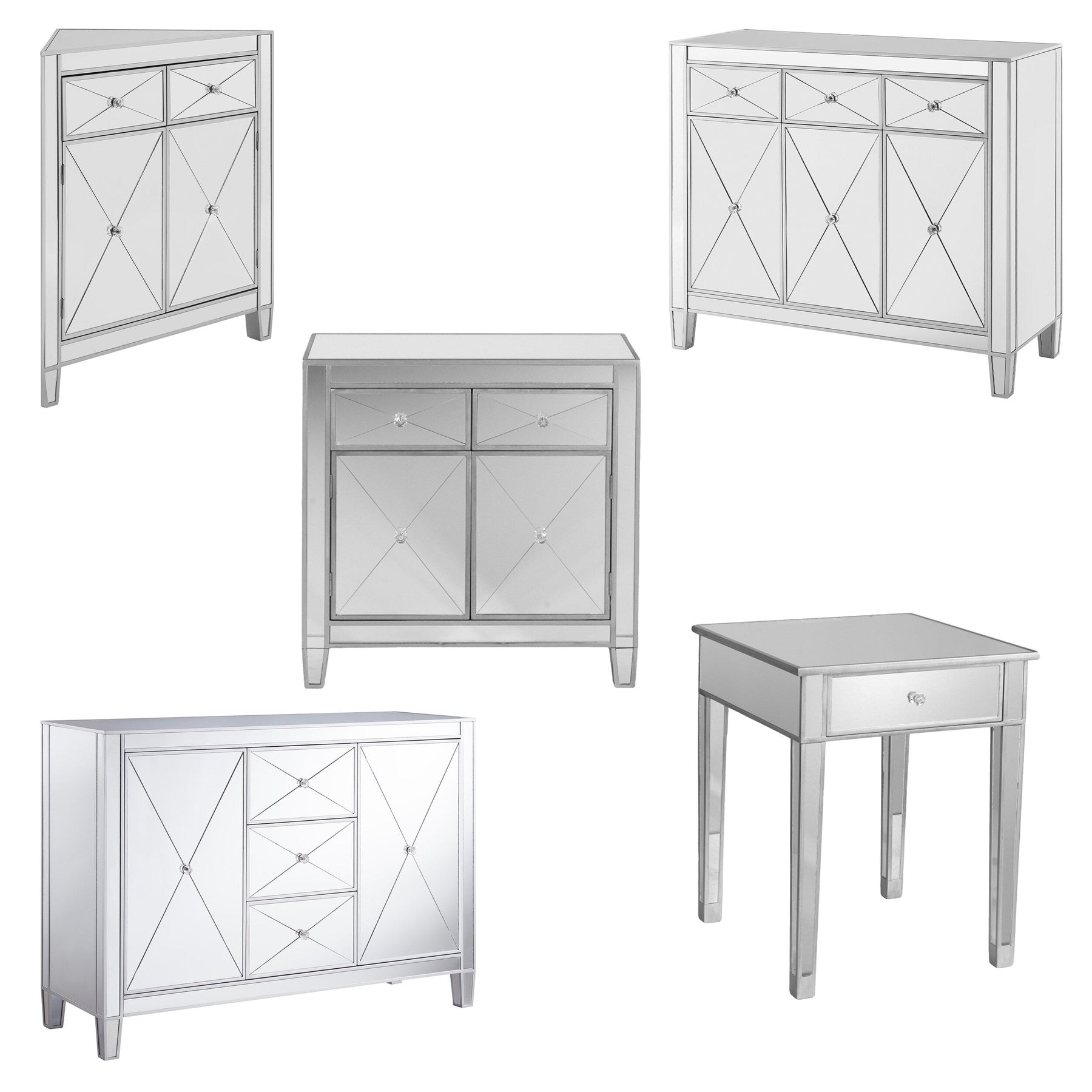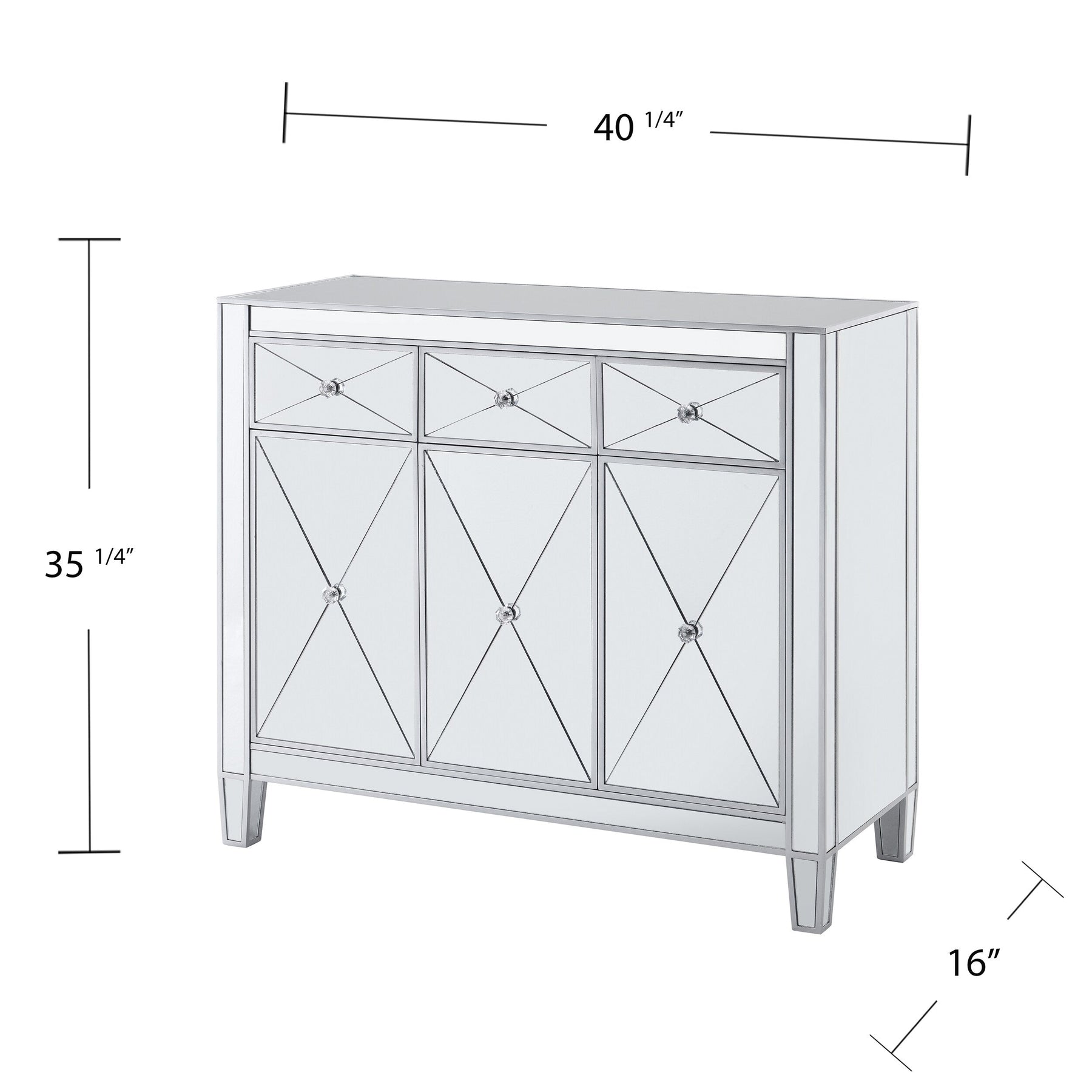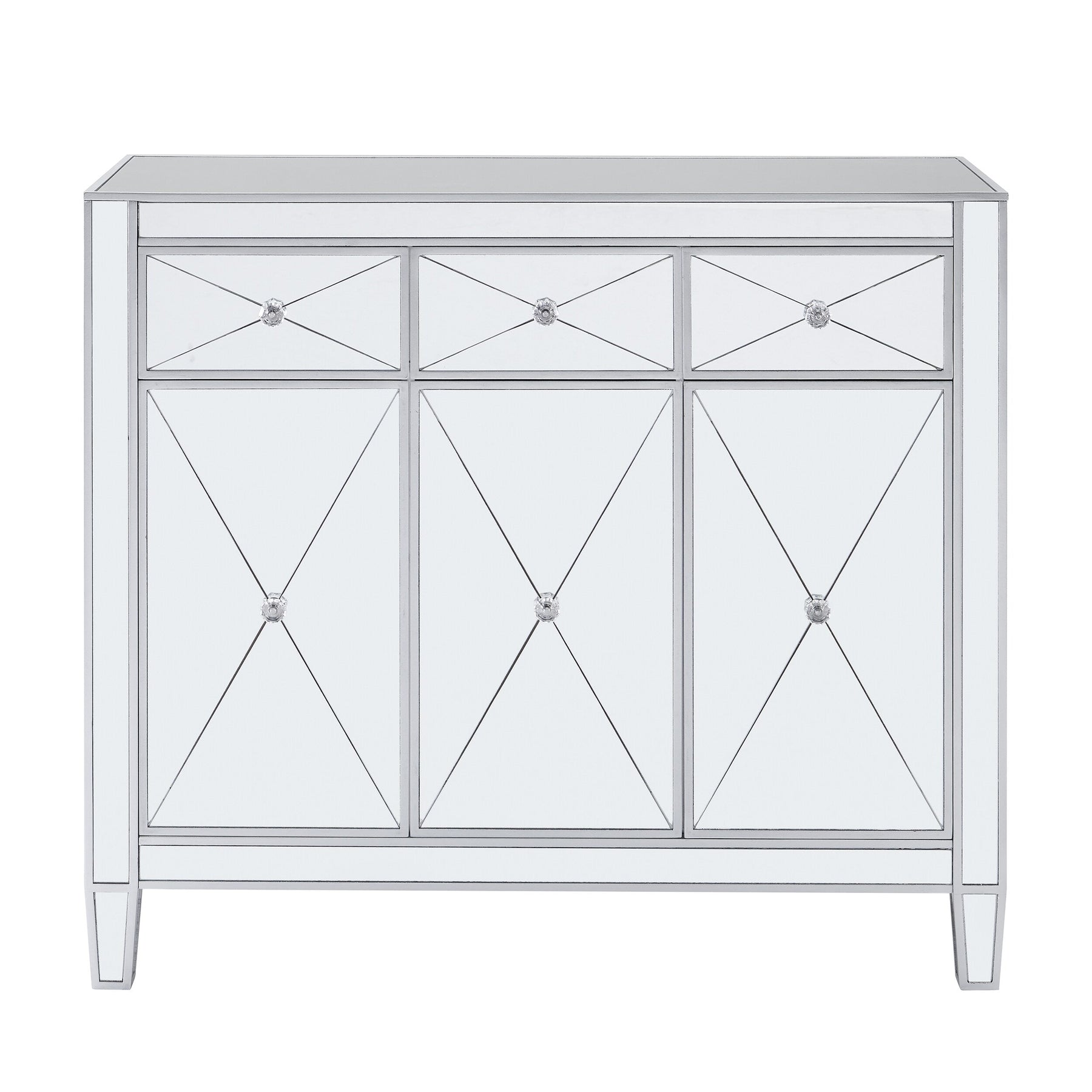Crystal Accents: Crystal-style knobs and criss-cross scoring add a touch of Hollywood regency to the design.