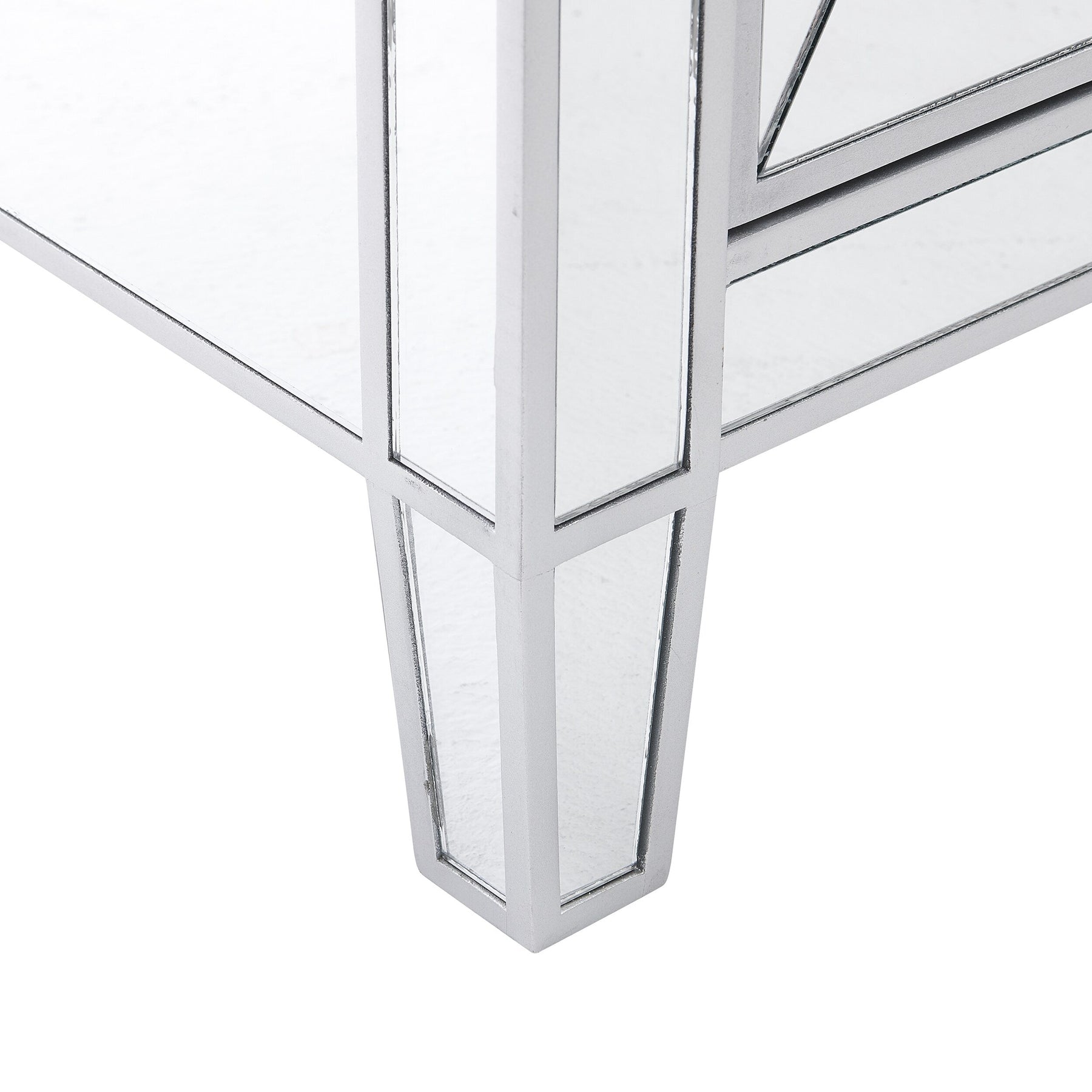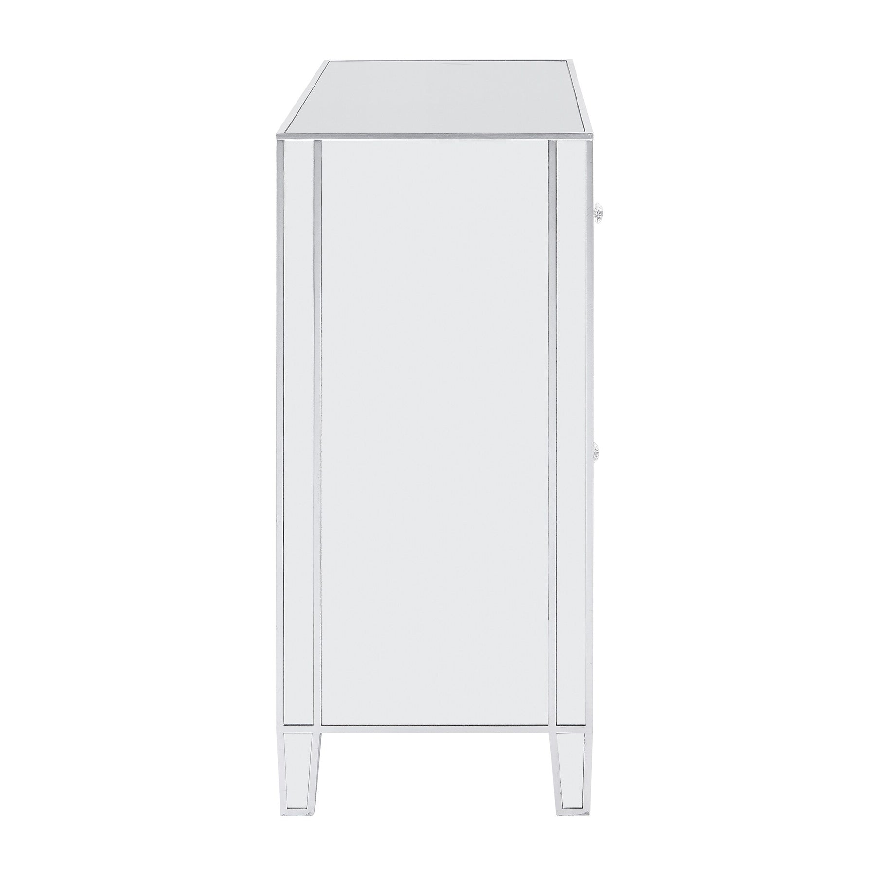 Transform your environment with the luminous appeal of the Mirrored Silver Trim Accent Chest. The mirrored surfaces dance with light, creating an aura of elegance and spaciousness in any room. A standout feature is the sleek matte silver trim which artfully frames each reflective plane, while faux crystal knobs imbue a touch of vintage glamour. Perfectly at home in a chic living area or an extravagant dressing room, consider adding this chest beneath an ornate wall mirror to complete your sophisticated sanctuary. Truly, this piece is a testament to the harmonious blend of form and function, positioning it as a hallmark of modern luxury living.