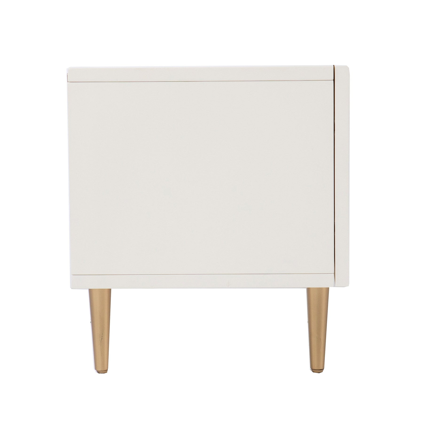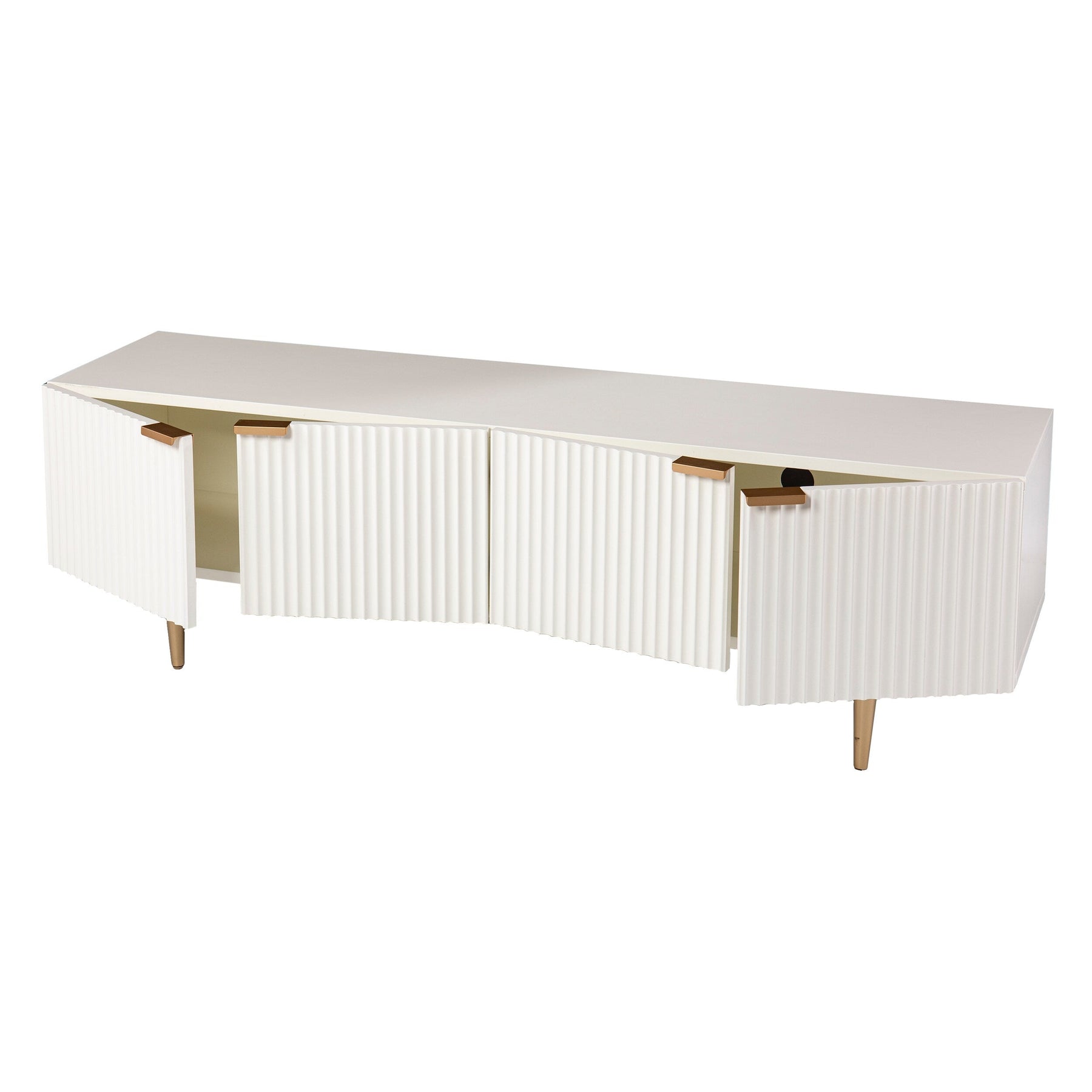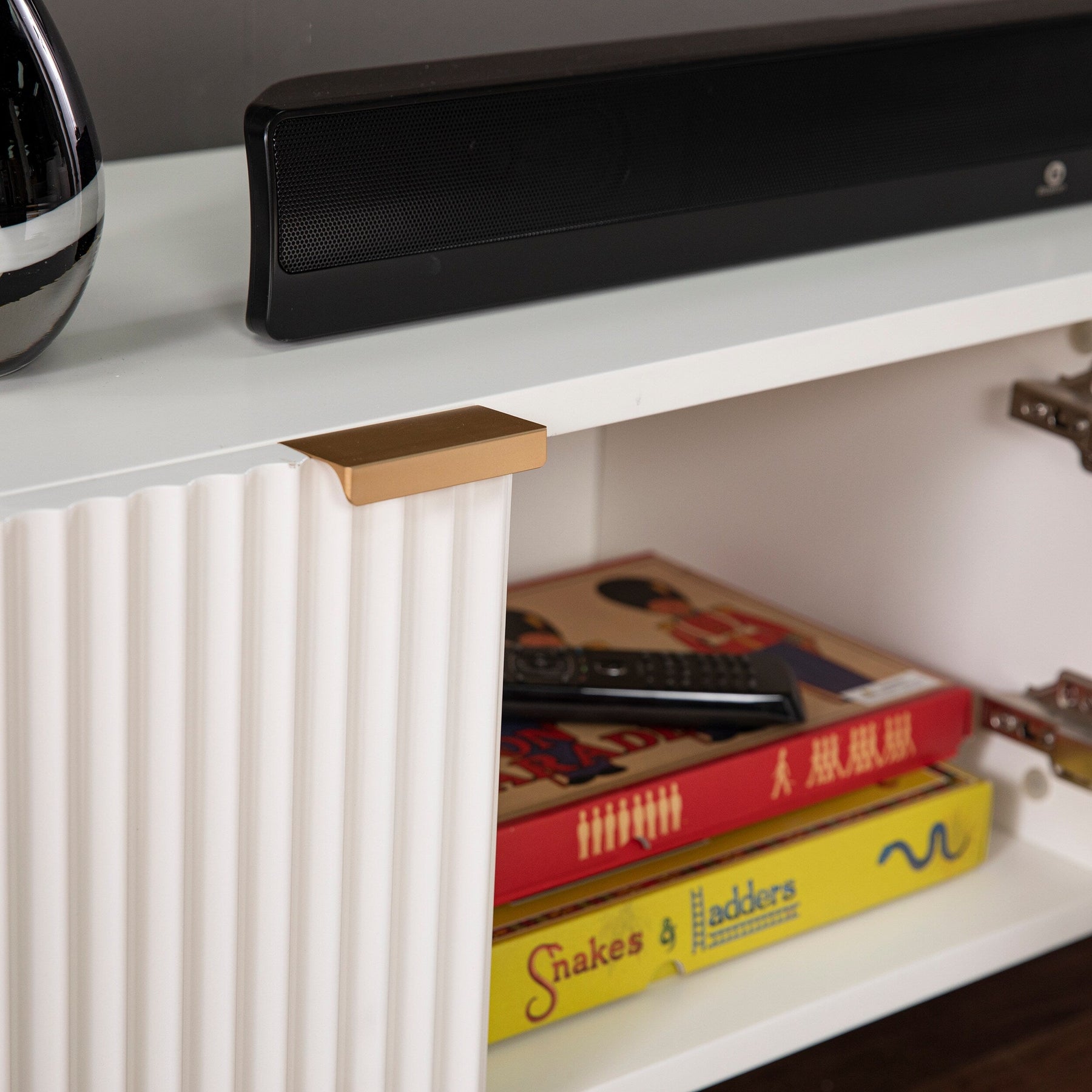 The Mesu Media Cabinet is a vision of understated elegance, bringing modern flair to any space with its white finish and lustrous gold accents. Its decorative ribbing adds a tactile charm, transforming it into more than just furniture—it's a statement piece. Consider styling it beneath a mounted flat screen or flank with coordinating decor pieces to complete a harmonious living area. Installed with ease, this cabinet becomes the heart of a chic, streamlined interior, embodying luxurious living through thoughtful design.