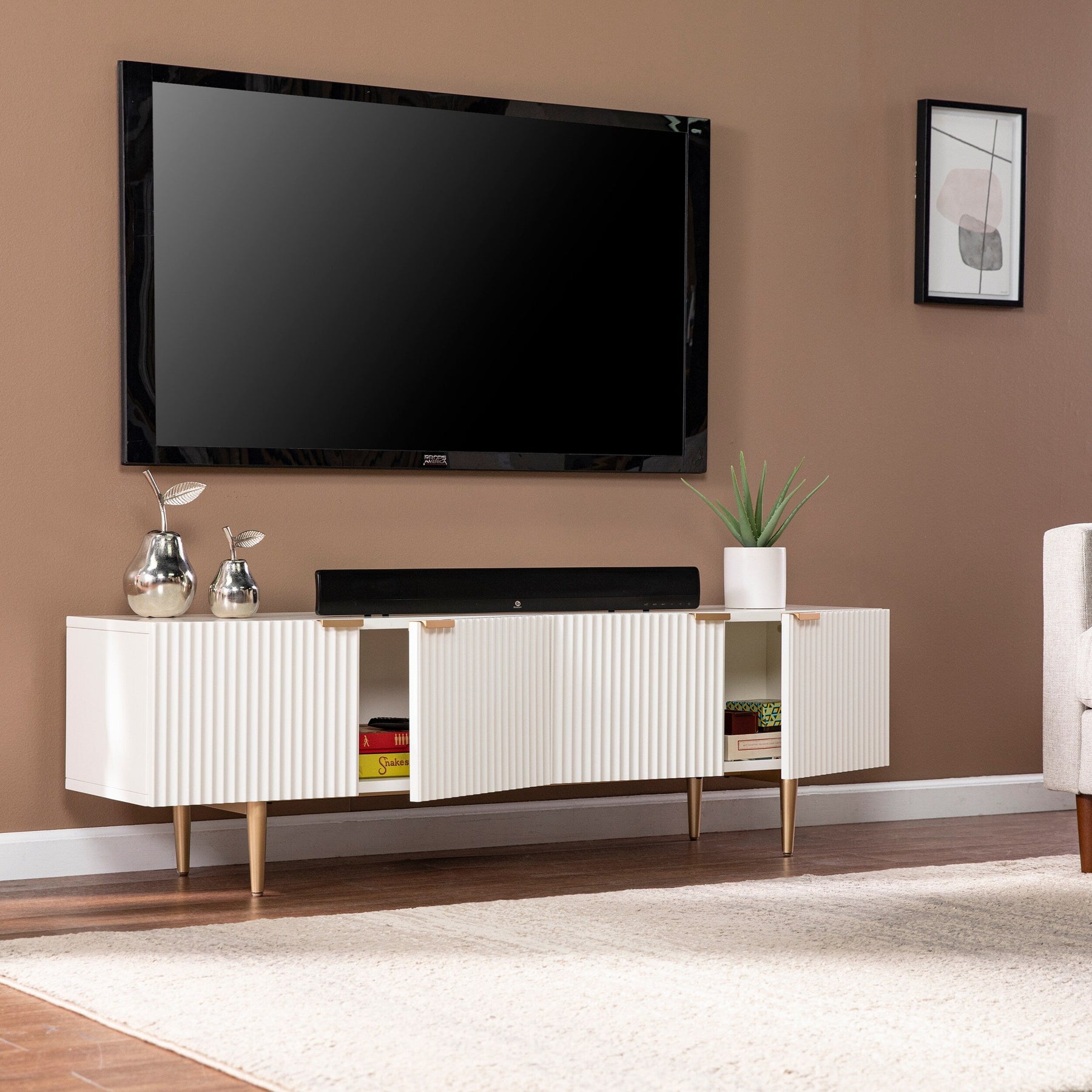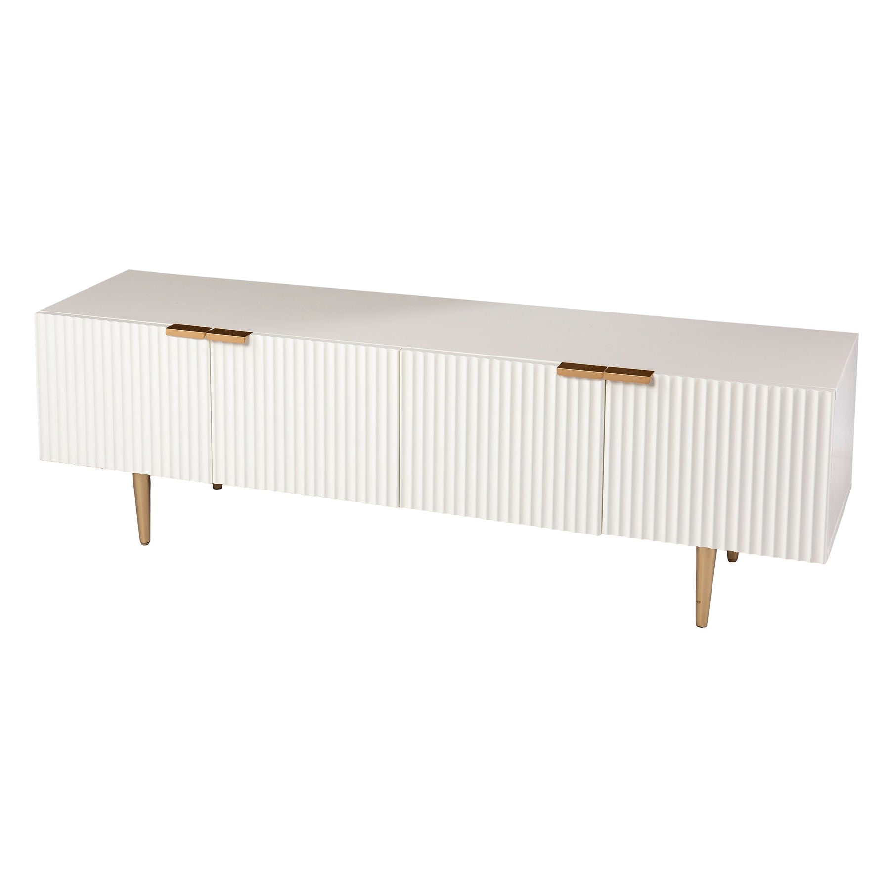 Elevate your living room with the Mesu Media Cabinet, a chic blend of contemporary design and functional storage. Featuring a low-profile silhouette with sleek gold accents, this cabinet accommodates most 58-inch TVs and provides ample space for electronics and decor.