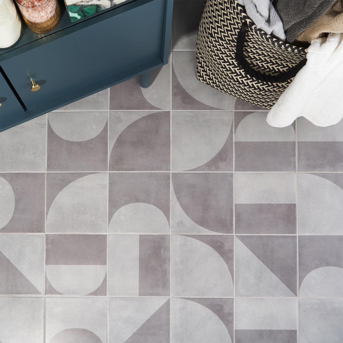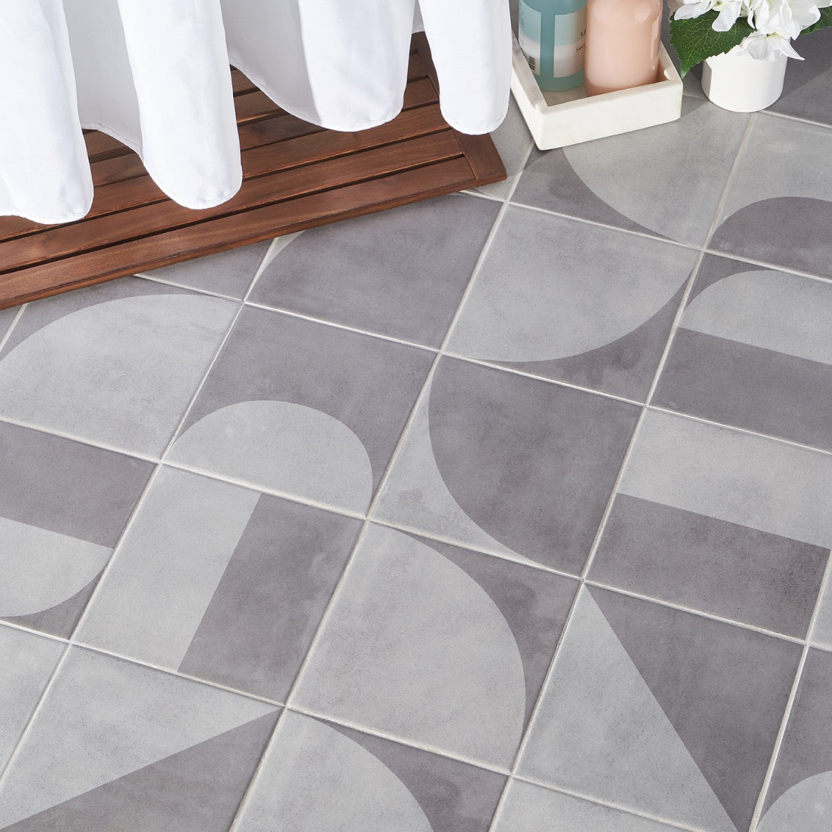 Q: What is the design style of the tile? A: The tile features a mid-century inspired design with a modern industrial aesthetic.