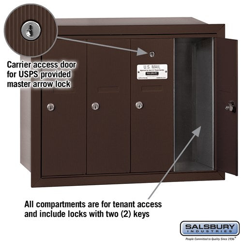 The Bronze 4-Door Vertical Mailbox is a recessed-mounted unit designed for USPS access, featuring durable aluminum construction and a powder-coated finish. Ideal for apartments and commercial buildings, it offers secure mail storage with individual locks and keys.