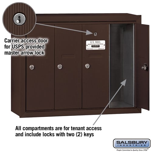 This bronze vertical mailbox features 4 compartments and is surface-mounted for easy installation. Made of durable aluminum with a powder-coated finish, it is USPS-approved for retrofit installations.