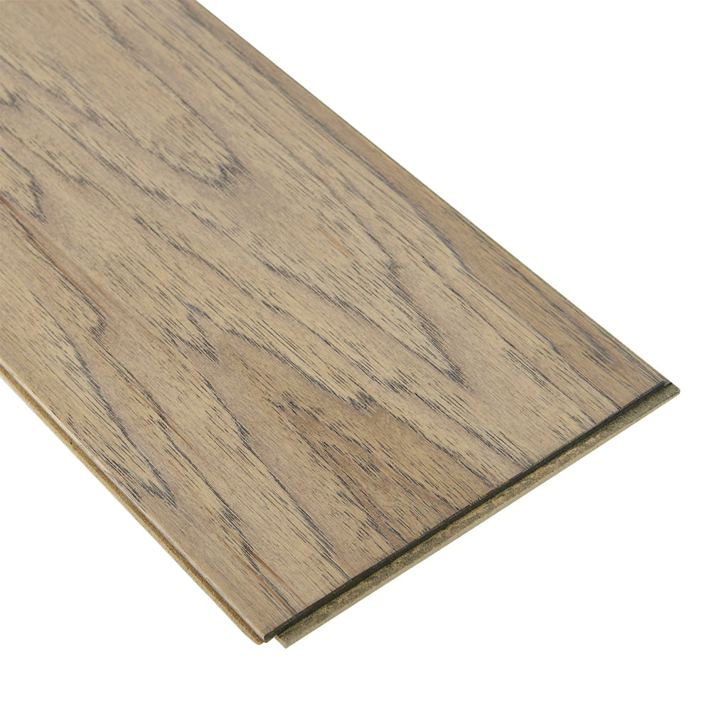 Transform your interiors with Bruce's Soft Brown Hickory Engineered Hardwood Flooring, offering a perfect blend of rustic charm and modern durability. These 6.5-inch wide, hand-scraped planks showcase the natural beauty of North American hickory, enhanced by a scratch and stain-resistant finish, all with the convenience of engineered construction.
