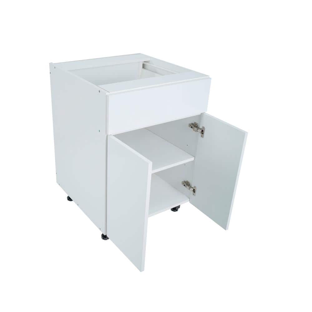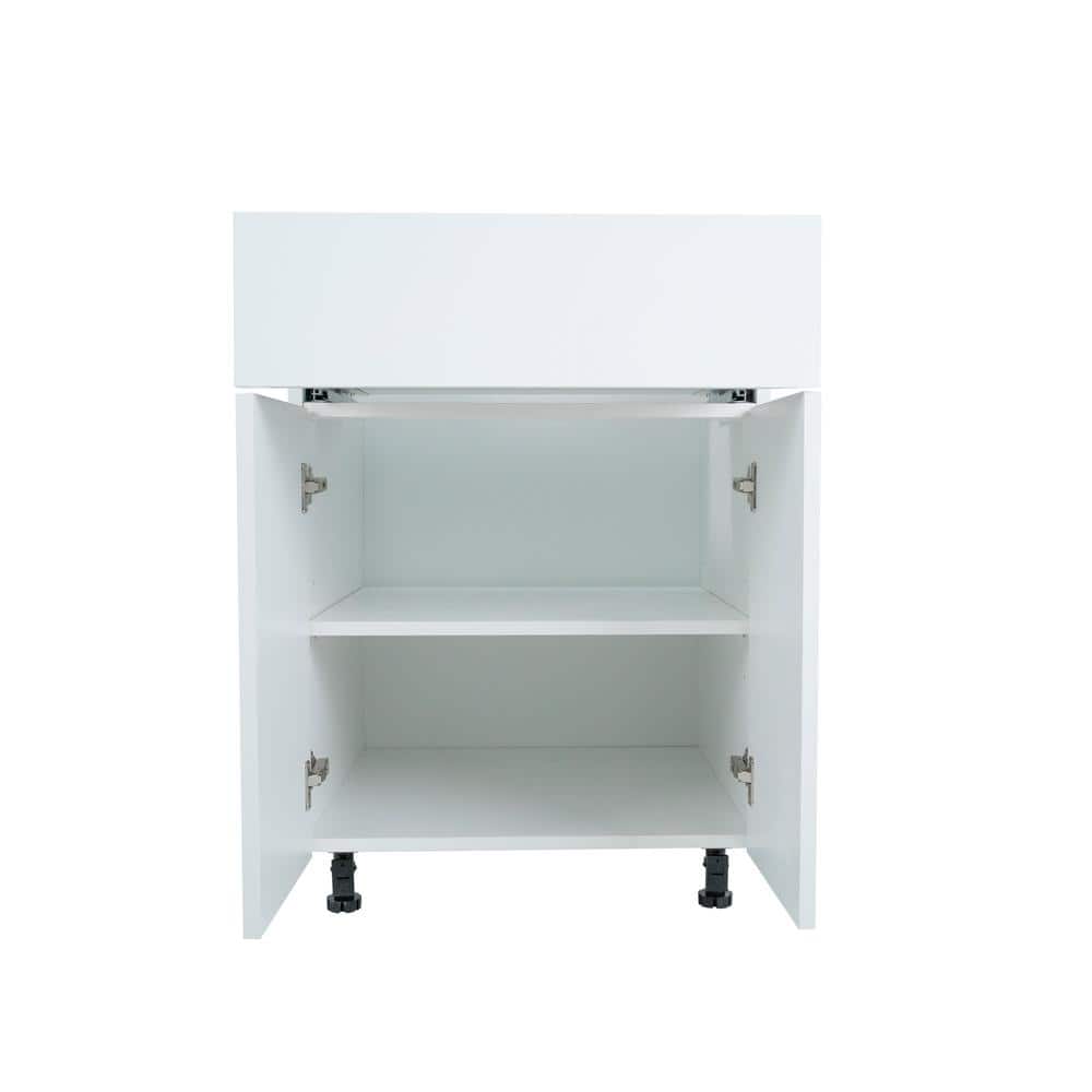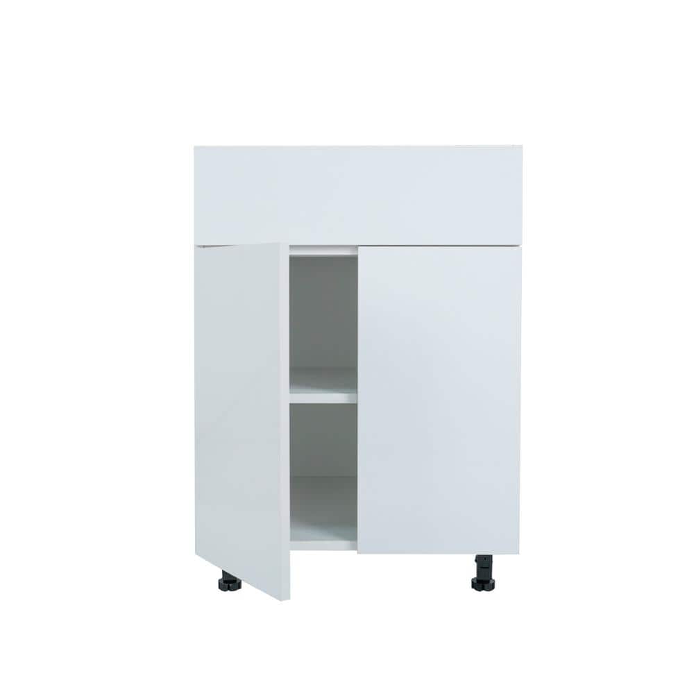 Elevate your kitchen aesthetic with the Cambridge Radiance 24-inch Slab Base Kitchen Cabinet. Featuring a sleek frameless design and a glossy white PET finish, it embodies modern style and functional storage, complete with soft-close drawers and adjustable shelves for personalized organization.